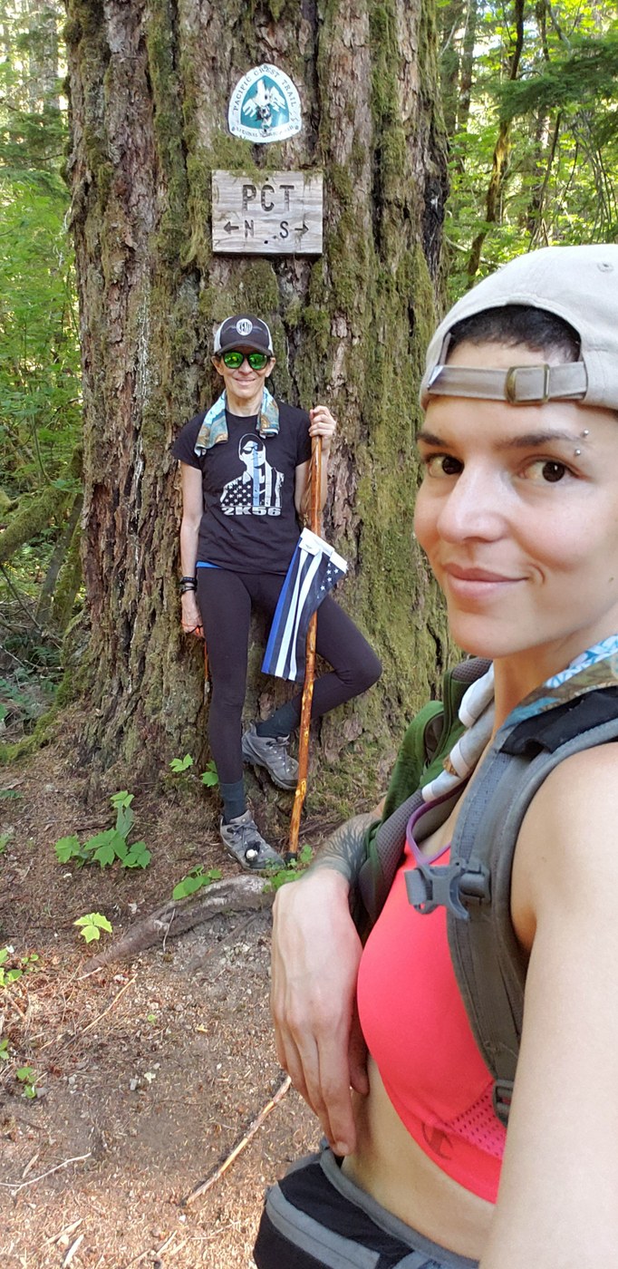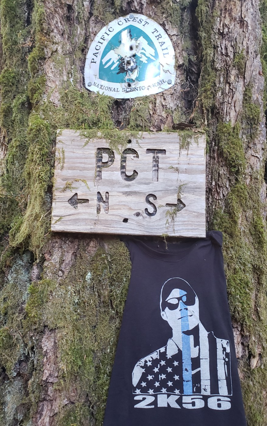 Day 5 – Tue Jul 21, 2020 – We slept-in!!! The common morning ritual, pee, coffee, back to tent, out of tent, oatmeal, and yoga. We enjoyed a complete state of quietness and leisureliness. At 1320 we started the hike on the PCT southbound. The plan was to do northbound today and tomorrow southbound but, the former had a bunch of switchbacks, and though a good hike per reports, we were inclined to do the southbound which seemed easier. It was a great decision. The trail was extremely pleasant, easy, and flat. Don’t get us wrong, we like challenges, but we were tired and wanted to have the last two days of our ritual as relaxing as possible. We took the mandatory PCT pictures with Diego’s hat and t-shirt having his presence with us along the way. All of a sudden, we heard tons of shootings. We froze. Are they hunting? On the PCT? In the woods next door? One, two, three, four, five, six, seven. Constant. Obnoxious. Annoying. Uncomfortable. More, more, and more shootings. On our ears. Where are they? Not being familiar with guns we hoped they were air rifles, and that the people were in a shooting range shooting at cardboard targets (there were not shooting ranges).
