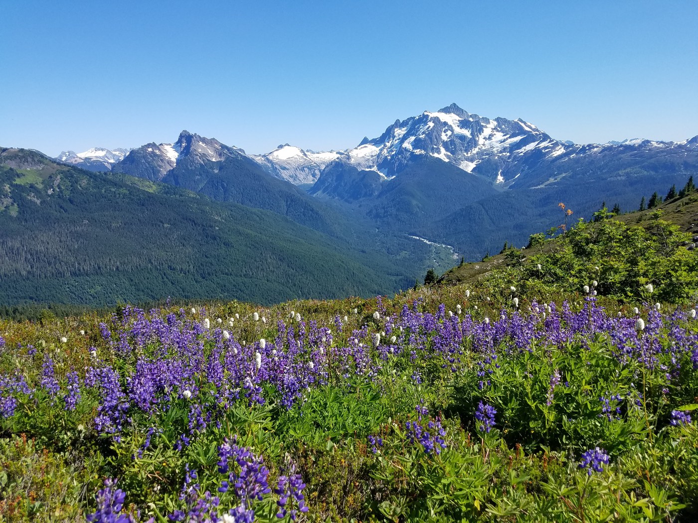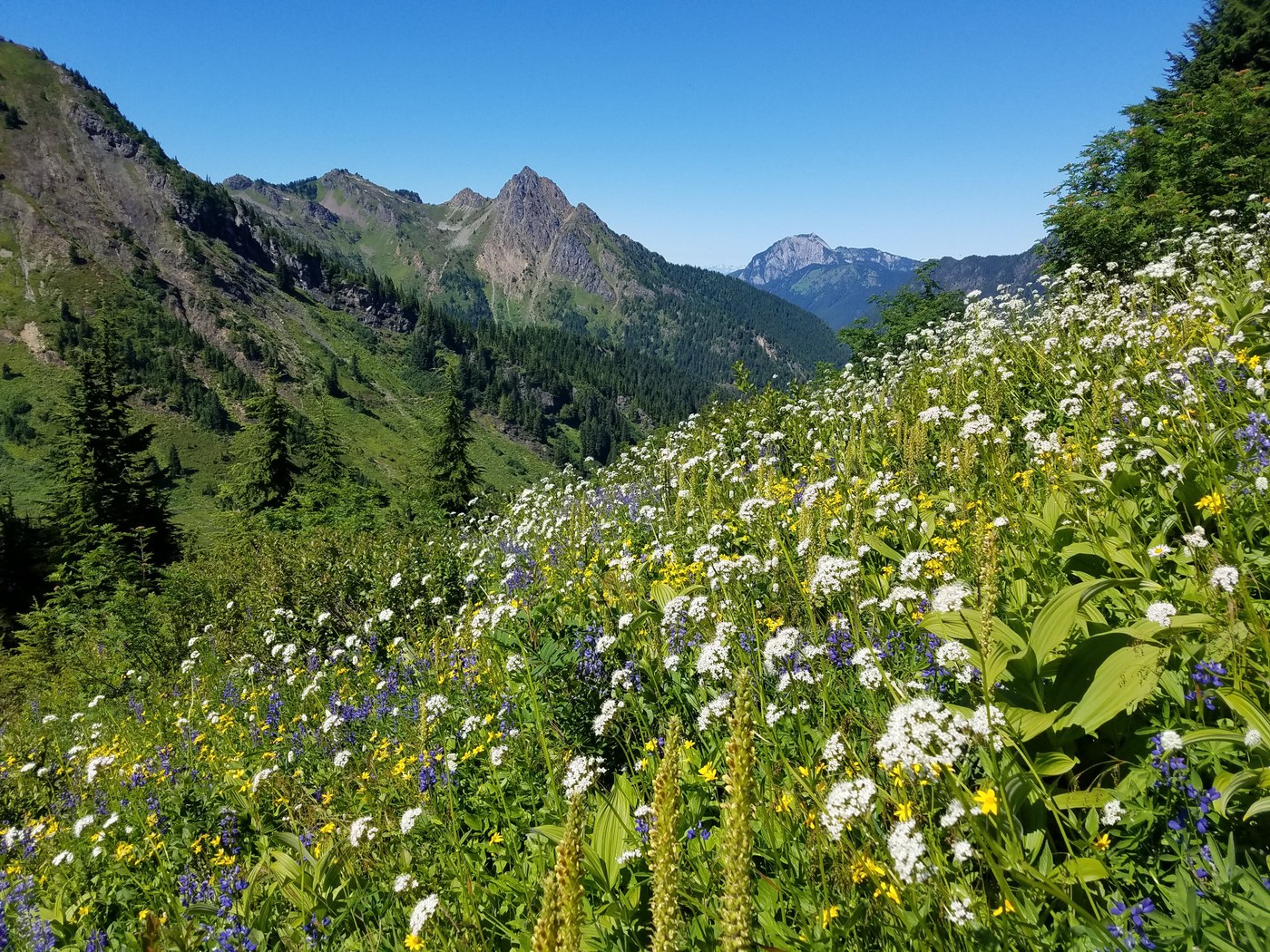 Lots of beautiful wildflowers carpeting everything on top and huckleberries & blueberries are starting to come out! We ended up doing around 7 miles total with 3750 ft elevation. Easy to do as a morning or afternoon hike.