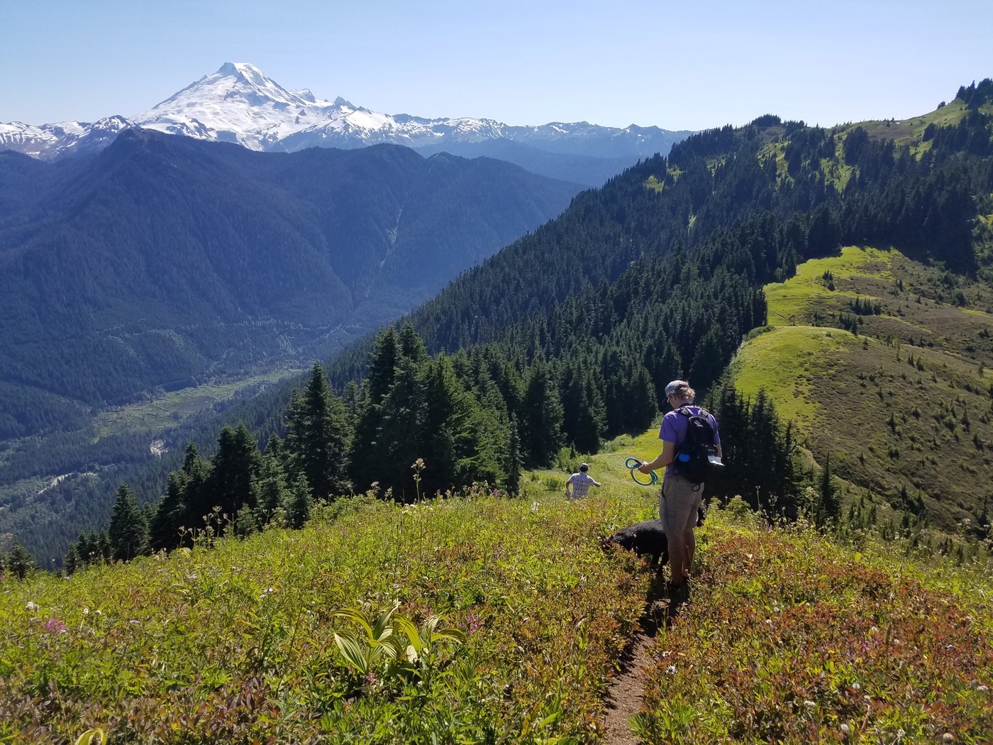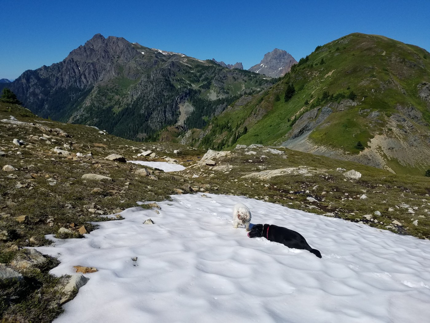 We had two dogs with us and were really looking for some snow to help them cool off. So at the pass we turned right and hiked towards Yellow Aster Butte with them until finding some snow patches on the eastern side. It also got us away from the flies because there was some wind over the ridge and we were away from the trees.