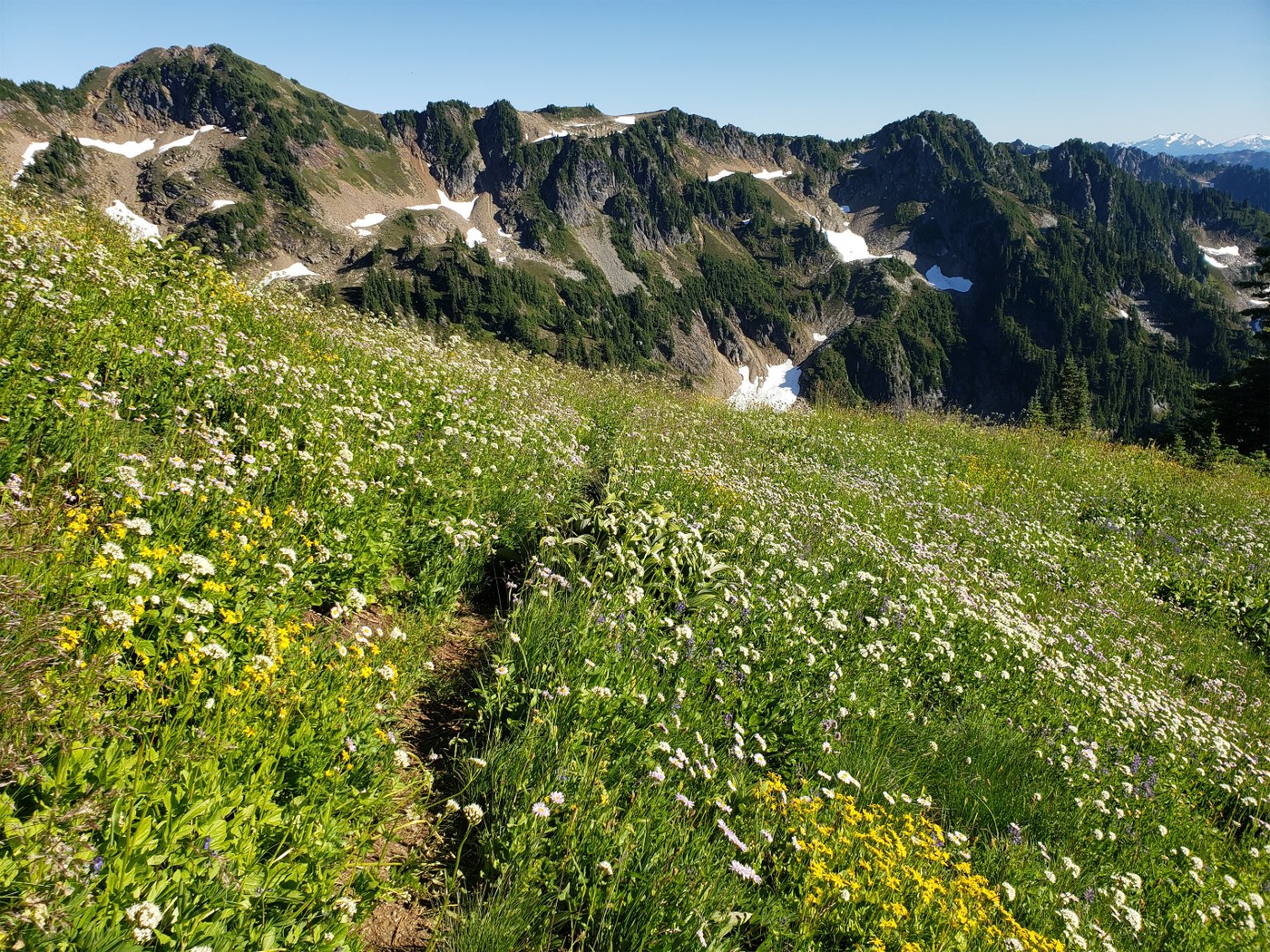White Pass: Lots of water (finally!) between Kodak and White Pass (and all the way out). Wildflowers peaking/totally insane around White Pass. Like the WTA poster pic for the description.