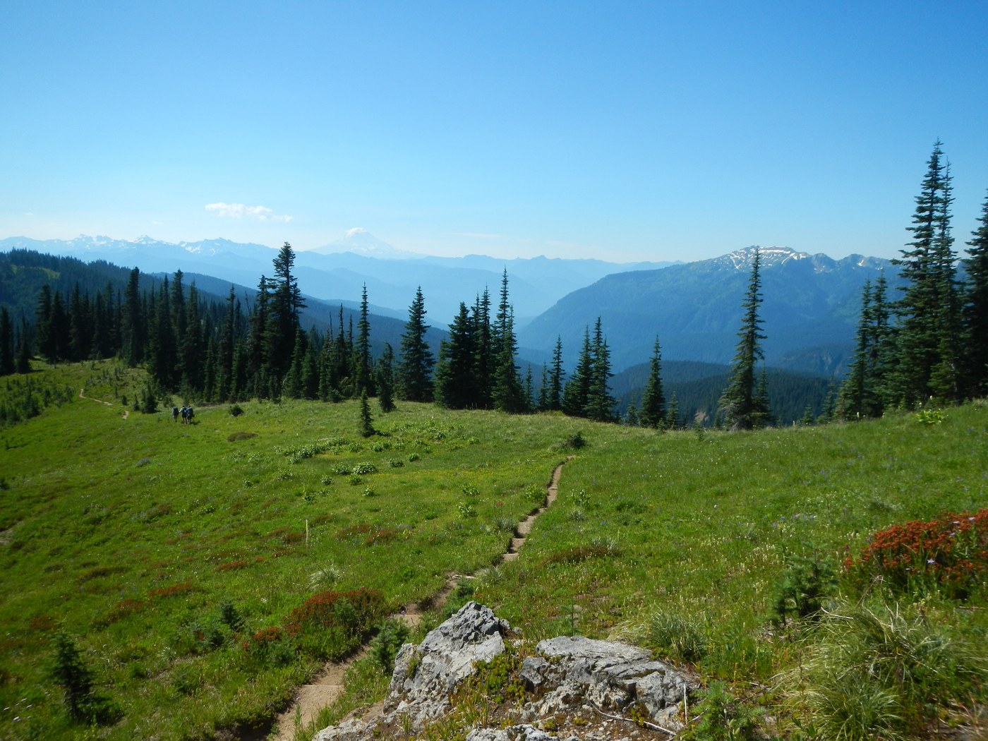 The next day I continued uphill on the Cowlitz Divide to the Wonderland Trail and kept going up most of the day. Once on the Wonderland the forest thins out and the scenery improved. That improvement came with a price, a lot of climbing. It was sunny and hot when I hiked it and went through water very quickly. A lot of check steps on the trail from 4800 feet up to a 5900 foot unnamed high point. I took a lot of time admiring the scenery and catching my breath as I made my way up the trail. Besides the ever-present Mount Rainier, Mount Adams was visible behind me when I would stop and look back.
