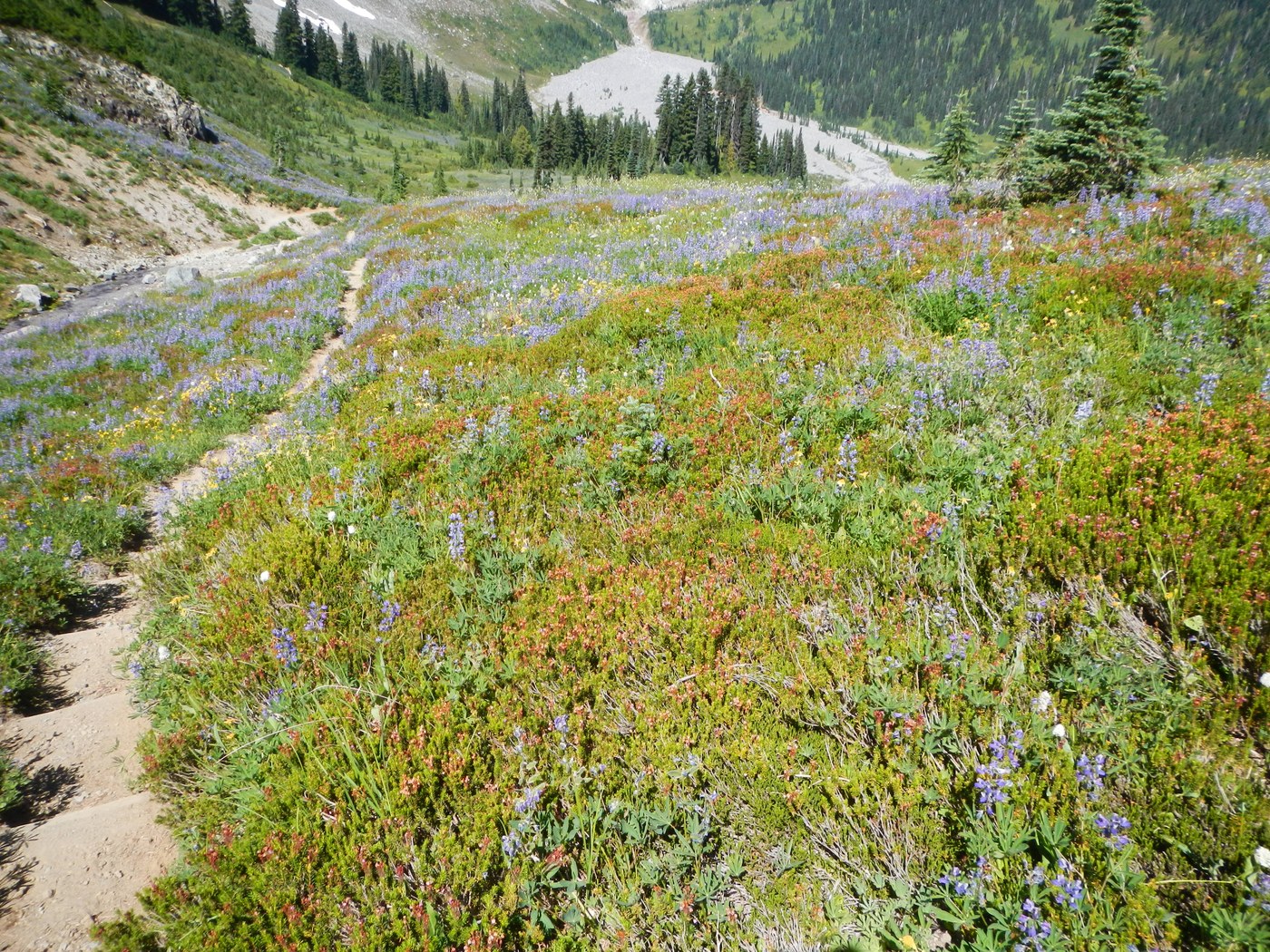 The wild flowers were in bloom and the fragrance was very nice. From that high point, I descended to Indian Bar where I stopped for lunch and water before climbing even more check steps on the trail to Panhandle Gap. Panhandle Gap was a welcome sight when I arrived. The high point of the Wonderland trail and my hike as well. On the descent towards Summerland I had to scramble over some snow patches and rocks. Even in late August, the snow persists at these altitudes. Reaching Summerland after my 9-hour hiking day was a welcome relief. Then I saw the signs warning of black bear activity in the area. Fortunately, I saw nothing larger than the resident marmot that night. A very nice composting toilet there.