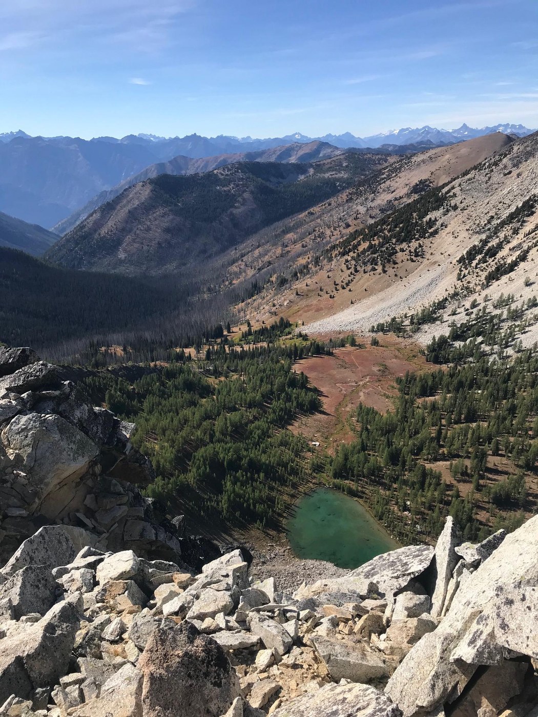From Gray we followed the ridge down and over to Courtney Peak. The approach from this side was a bit challenging. It was mostly a scramble over large boulders with a few areas that we exposed enough to get the adrenaline pumping a little. It's a bit of a choose-your-own-adventure situation from this side of the mountain without much of a defined trail to follow. There are several false summits. The views of middle and east Oval Lakes from the top were outstanding!