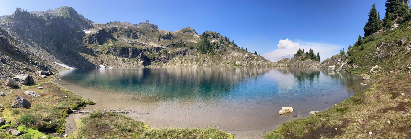 Beginning at Stevens Pass the first eighteen miles or so of the trail are lovely, with gentle grades, numerous lakes to swim in or perch beside and excellent views. The view from the top of Grizzly peak, with its ripe berries, flocks of birds and glimpses of Glacier is particularly exquisite. Popular Valhalla Lake has a nice beach, making for good swimming. Janus Lake is marshy and warm. At Pear Lake there is a large clearing where several groups can camp and a pair of good spots for swimming.