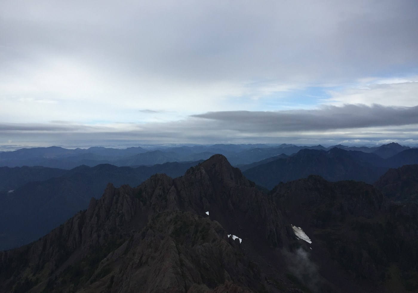 Eventually the trail intersects with the bottom of a narrow ramp that turns and ascends sharply southwest (climber's left). This is an important terrain feature that can be missed if you are not on or near the trail. One of the parties we met had dropped too low down-slope and overshot the ramp by a quarter mile. A well-defined trail ascends the ramp and, once on top, heads in a northeasterly direction traversing just below the ridge that connects Mount Washington with Mount Ellinor. Eventually the trail arrives at a saddle just below the summit where spectacular views of the vast interior of the Olympics greet you. Excitement builds as you see the trail ascending towards the summit.