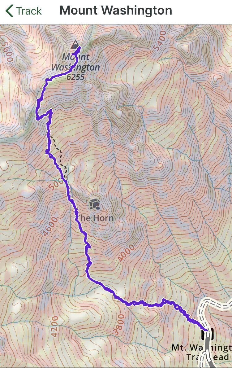 During the course of the day, we ran into two parties doing this hike for the first time, and both parties expressed being a bit disoriented. For those who've never hiked Mount Washington, there are a couple of spots where it's easy to get off track. The first occurs after climbing to the top of a barren scree/talus slope above the first meadow, then making your way through a steep section of low-growing trees to the bottom of a narrow, wooded gully. High above and to the right is rocky pinnacle referred to as the Horn or the Tooth. The gully drains the west (climber's left) side of the Horn. Standing at the bottom of the gully, you can look up the gully and see a saddle above the trees which is the desired destination. A well-worn trail ascends the gully, but if you stop and look 90 degrees to your left, you will see a very faint path descending a short ways towards the west shoulder of the gully. Walking down, you approach the base of the shoulder and a trail comes into view, zig zagging its way uphill. This steep but short route is preferable to being down in the gully, and it doesn't take long to reach the saddle above the Horn.