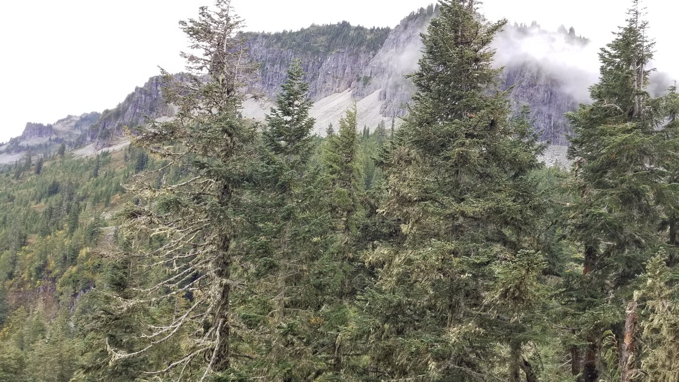 Busy trail, lots of water on the trail (not deep) and a decent amount of mud. The top was quite cold in the open and a few lazy flakes fell. Amazing views. There are a few streams to cross and one of them has a washed-out mini-bridge, a little bit of balance required to cross it.
