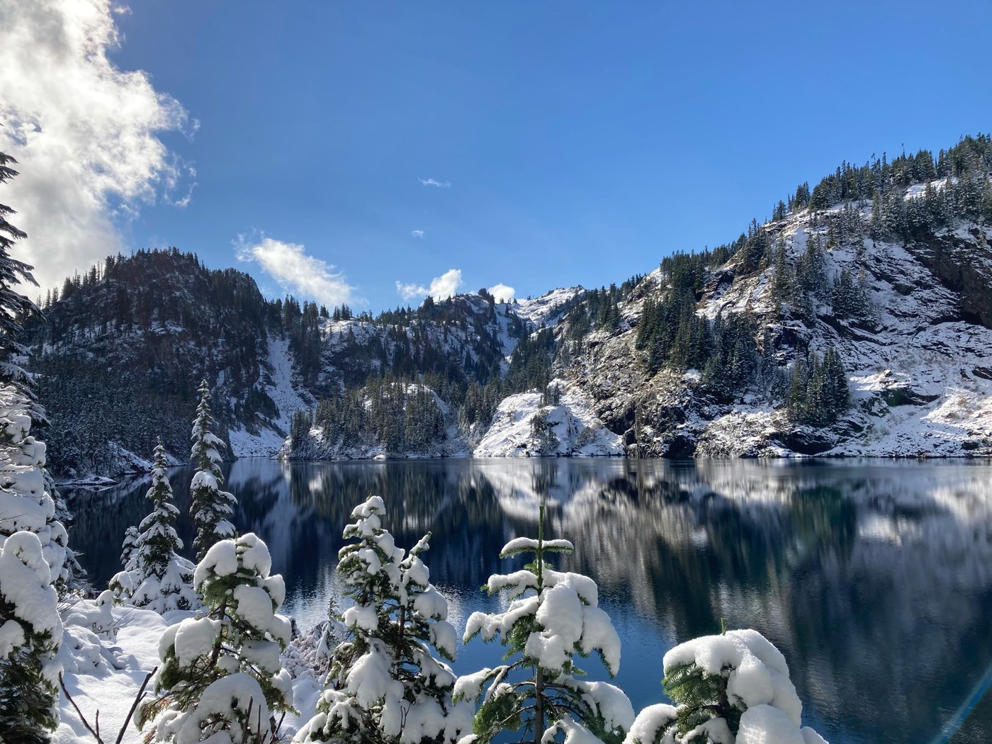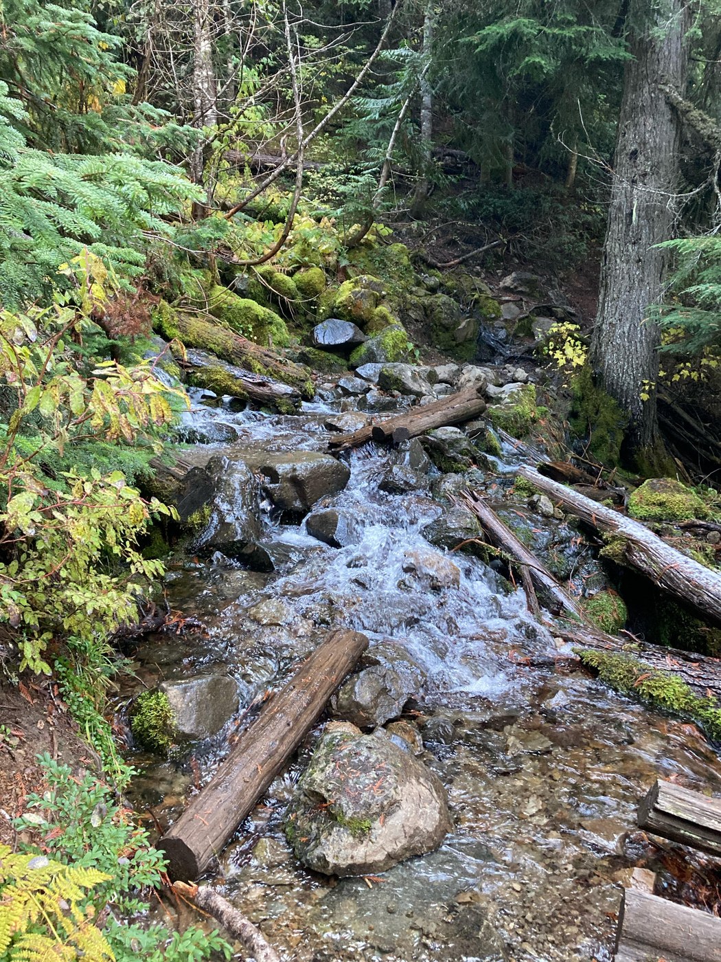 The road and trailhead were snow-free this morning, but it is shoulder season for sure up here. The dry streambeds you climb up in the summer are wet and active, with several tricky crossings across deep or swift streams, lots of water on the trail, mud, wet rocks and roots, and snow starting partway to Rachel Lake, where the air was definitely wintry. The snow is about 4-5" thick up on the ridge with lots more forecasted tomorrow for the region.