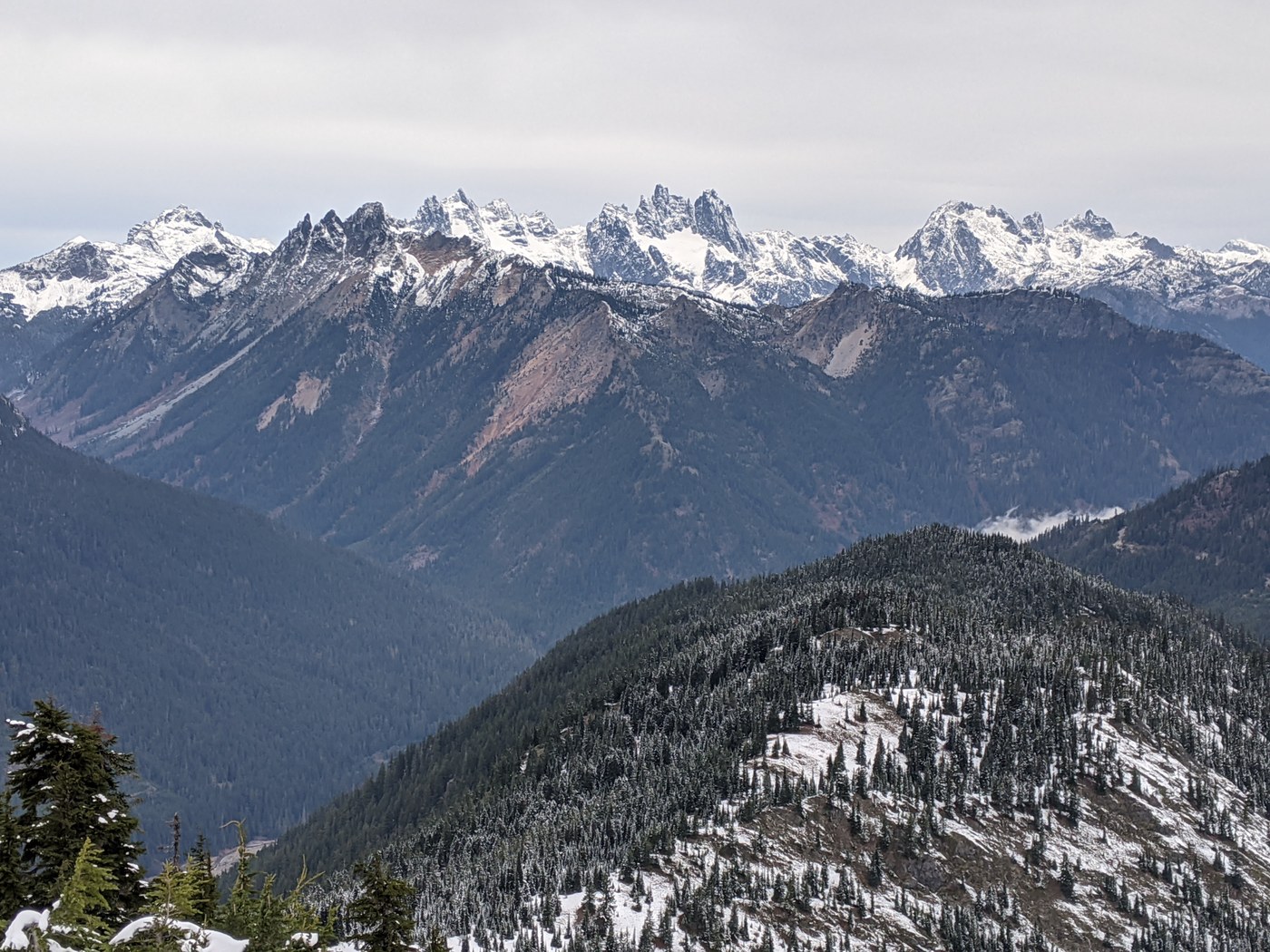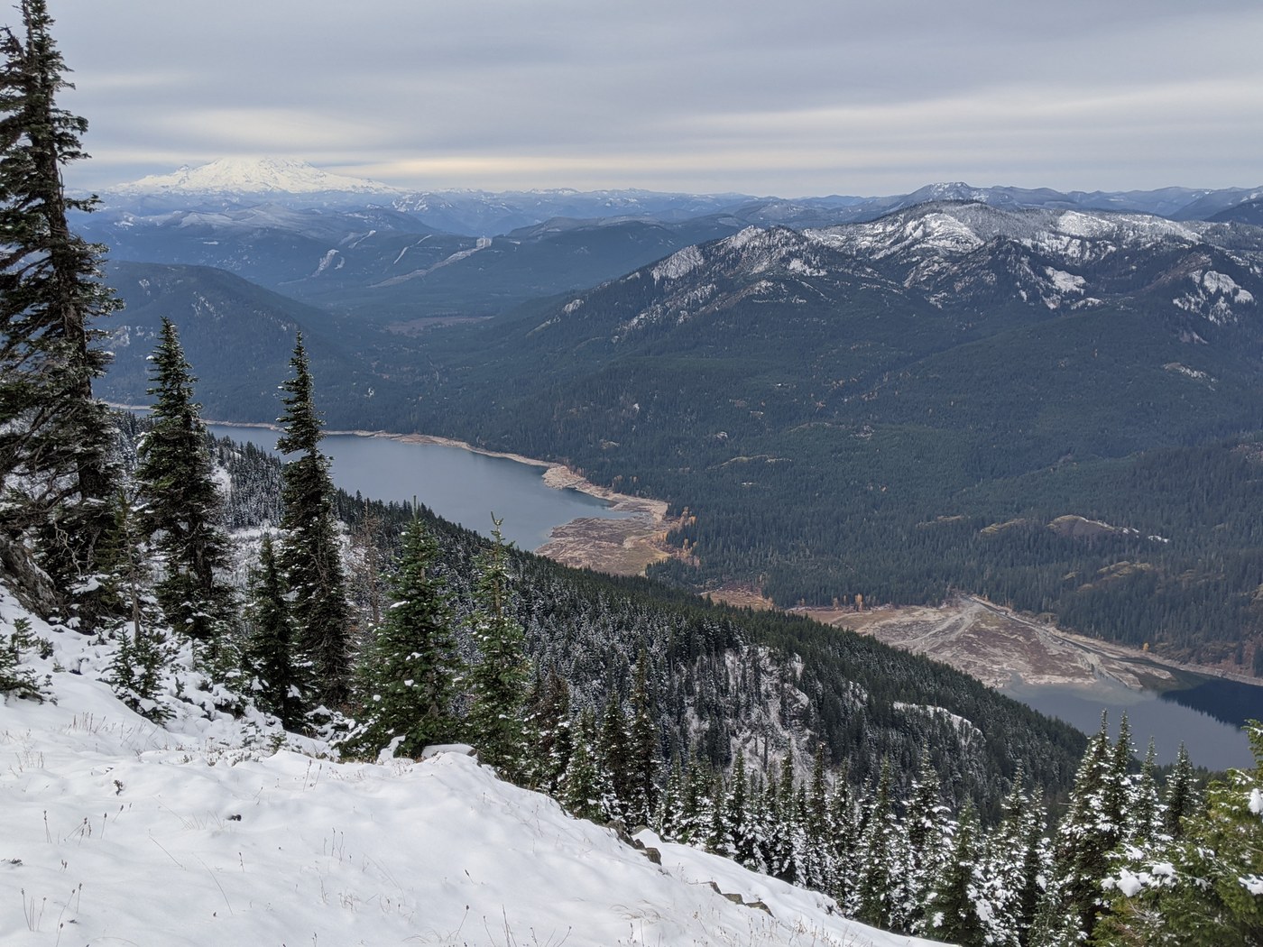 I walked the road until it started to curve around a switchback. Here I left the road to hike XC up through the forest above Knox Creek to cut the switchback to shave off some distance of road walking. The trail itself goes up some nice moderate switchbacks, getting snowier as you go on. Microspikes are good to have packed with you. The trail then more steeply works its way up along the head of the creek drainage before reaching the Kachess Ridge Trail. I turned right and hiked along the ridge and then along the left side until another junction, where I went left up some more steep short switchbacks to the lookout. Great view of the peaks from Hibox north past Chimney Rock to Mt. Daniel, out to the Stuart Range, and Rainier behind Kachess Lake.
