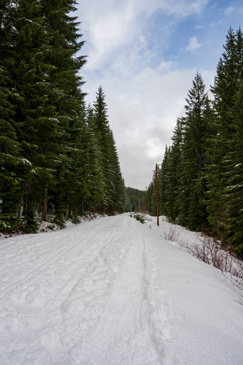 There were lots of people out and about today. We followed the Palouse-to-Cascades trail from the Sno-Park parking lot. The snow was pretty compact close to the parking lot, but further out on the trail the snowshoes felt more appropriate. There were several signs pointing to side paths for snowshoers. We followed some of these, mostly just wandering our way up the trail. There was one outhouse open along the trail, near the Cold Creek campsites.