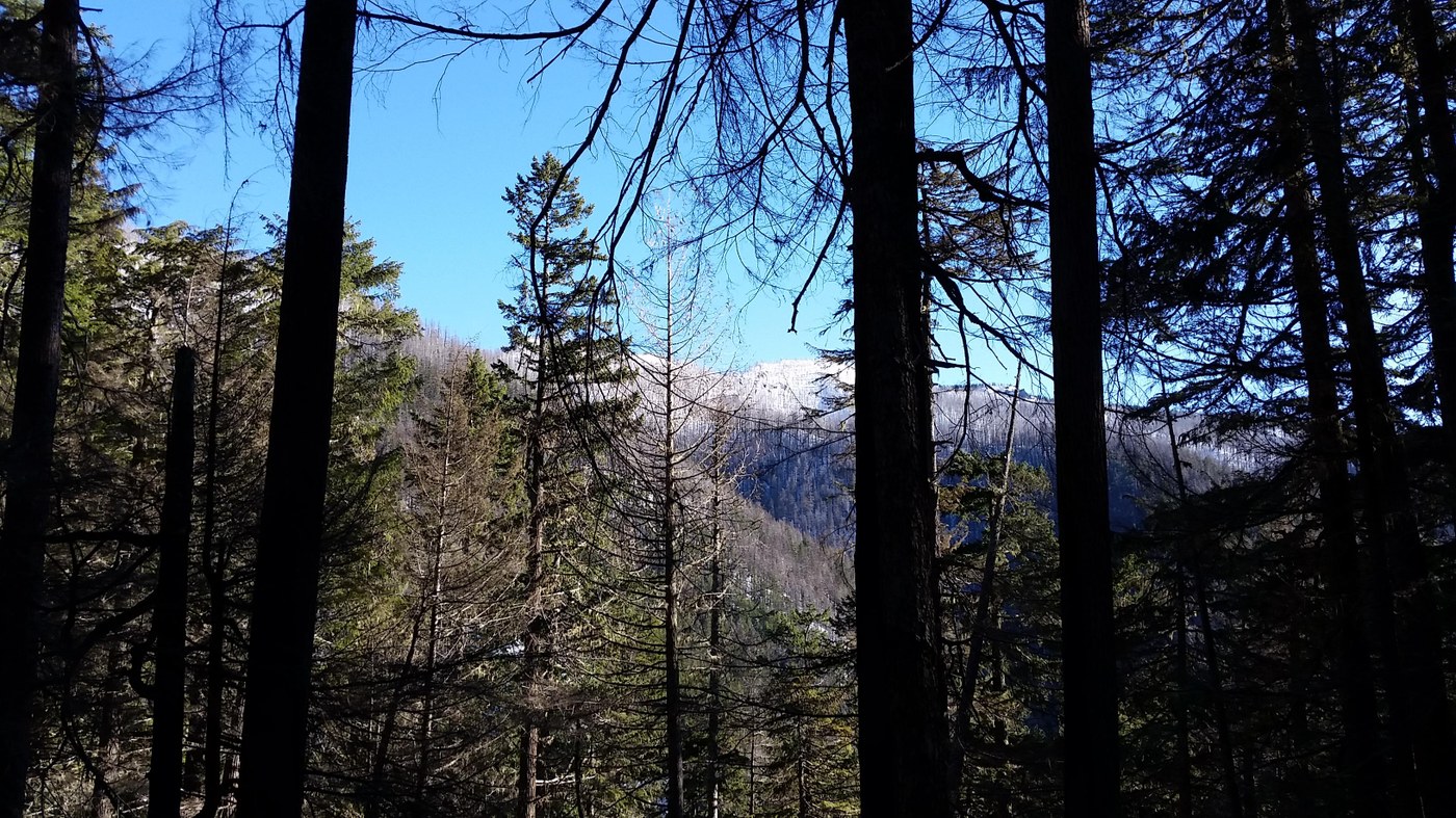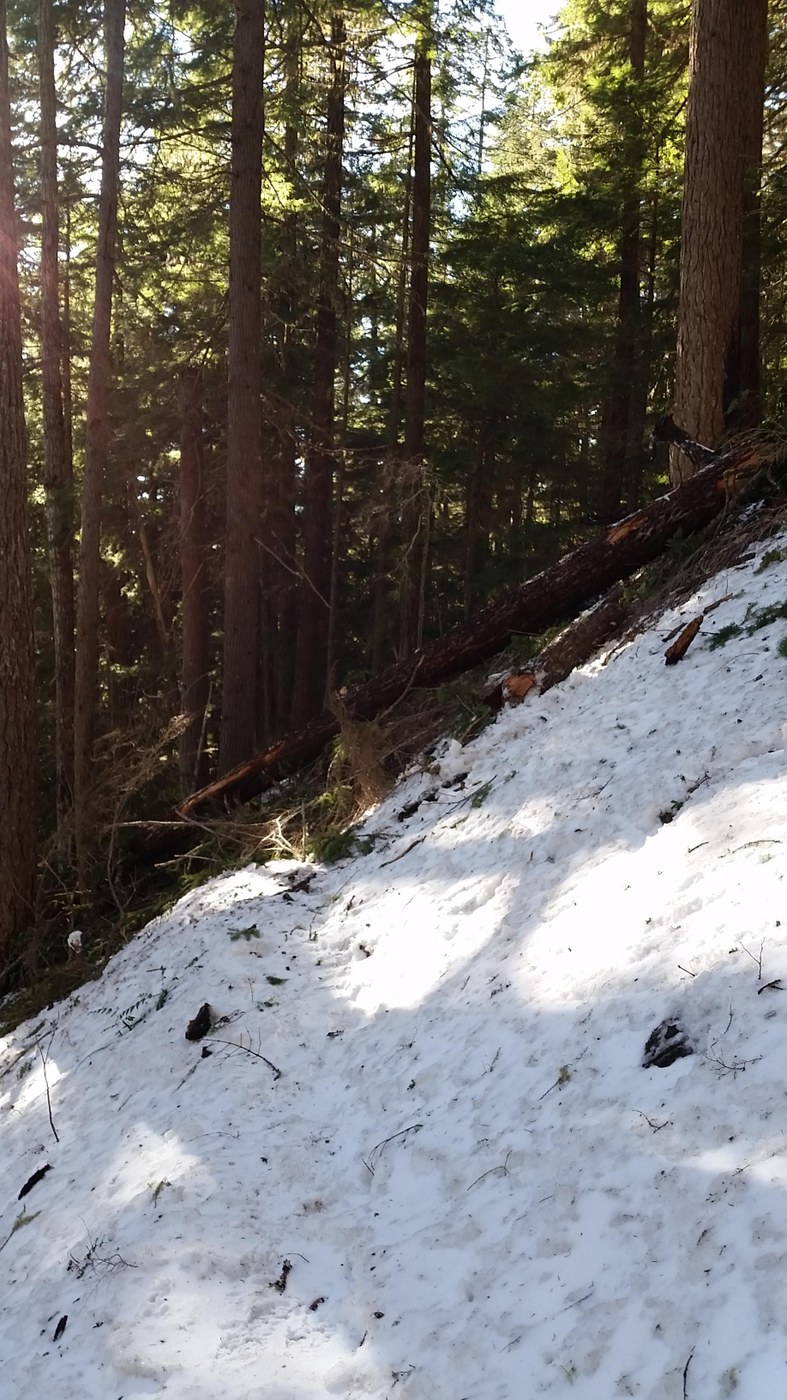 Our goal today was Dalles Ridge. Temperature at 9:30 a.m. was 34 degrees F, with zero chance of rain in the forecast. We figured that the ridge may be reachable, given the warm temps and rains of the past few days. Indeed, it was a gorgeous day. Five days ago, there had been black ice on the way to the Little Ranger Peak viewpoint, but today it was virtually ice free until just after the turnoff to the Ranger Peak viewpoint. There, light snow soon became several inches deep in places, then dense, thick, compacted ice. I figure we hiked about 1.3 miles before pulling a U-ey, due to the fact that we seemed to have hit a series of avalanche chutes.