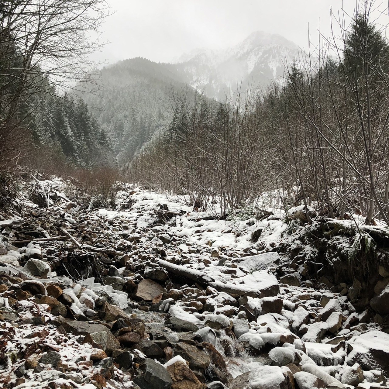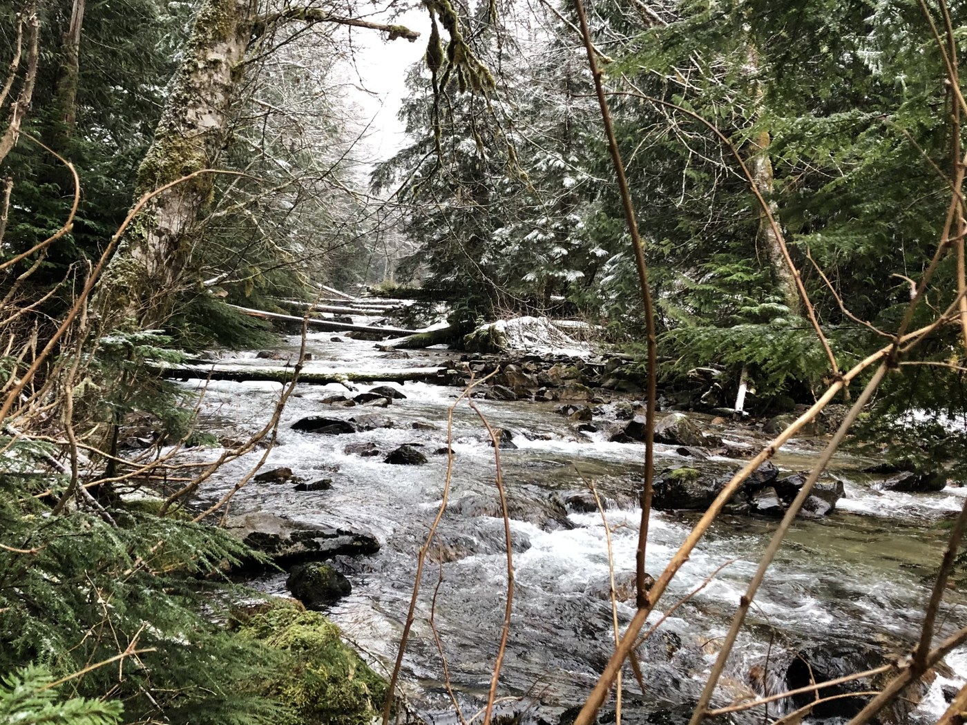 The trail itself had a fair amount of downed trees but all were, again, easily triumphed (though some required more balance and flexibility than others). Stream crossings were fine, very little ice. Some intermittent snow but did not use snowshoes or traction devices. We went as far as the Pilot Ridge junction before turning around, though conditions appeared the same as far as the eye could see around the next corner.