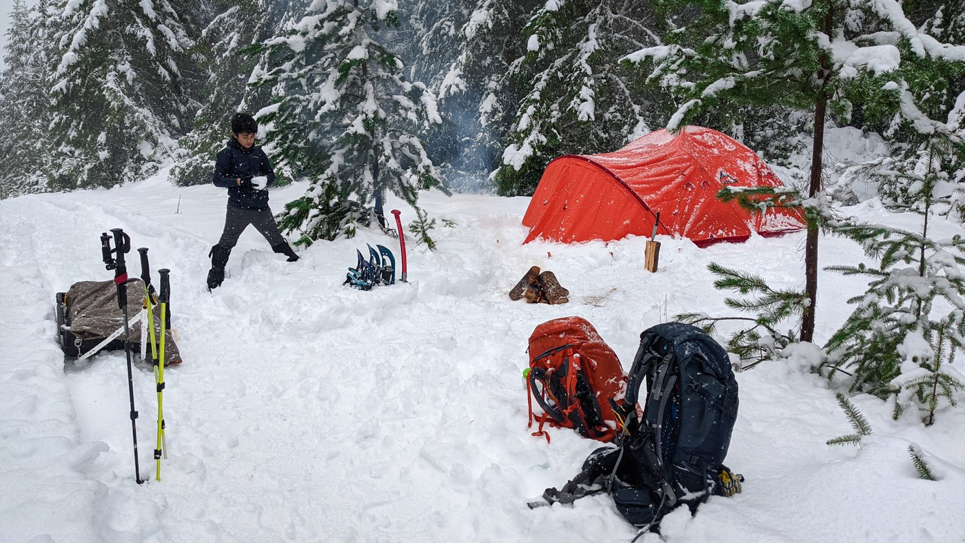 Since we live within walking distance to Forest Service Land, we were able to hike a snow covered logging road to an ATV trail. We pulled a sled that had some extra gear like a four season tent, our snowshoes and some firewood. After a couple miles we found a nice little spot to set up camp for the night.