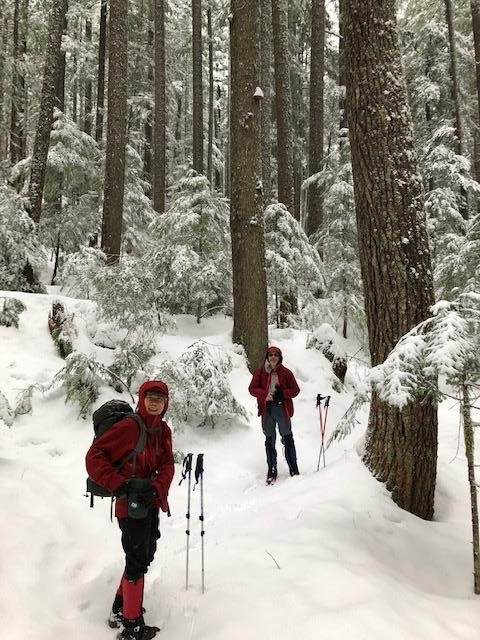 We crossed one at a time, watching each other. Beyond the open slope the trail was obliterated, and the steepness combined with iciness under the new snow made us turn back. So we retraced our steps down, and hiked the loop counterclockwise. We got a lot further going this way, passing the turn off to Pyramid Creek Camp and continuing a good mile along the straightaway roughly paralleling Kautz Creek. Then we met another avalanche slope. We looked up and saw what appeared to be the top of the ridge just 20 feet above, so we headed straight up. At that point we ran into the Pineapple Express with strong winds blowing icy snow horizontally, and retreated. Even though we didn't quite make the whole loop it was a great day of snow hiking.