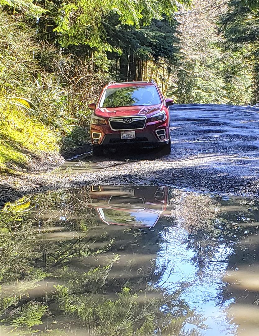 Early bird gets the worm!! You have a red Subie! I do too, a new little Crosstrek and I really am waffling about taking it on that kind of road. Nice pics of the lake, I love that hike, but only when it's quiet.