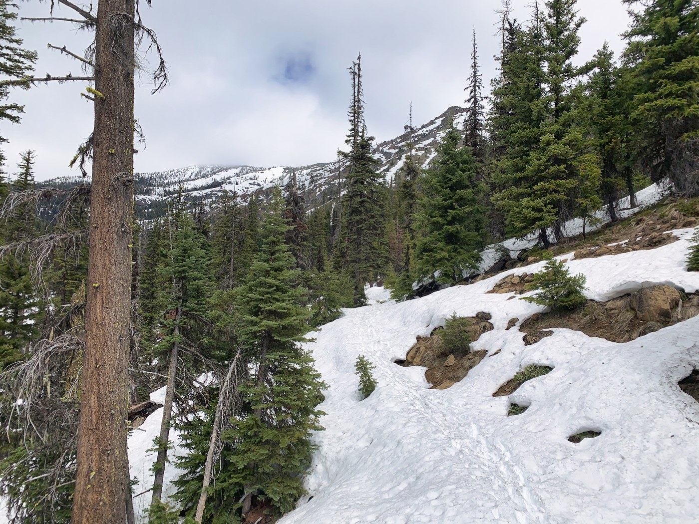 The snow was fairly firm for the most part, with the occasional knee deep postholes to keep you honest. We carried micro spikes but never felt the need to use them