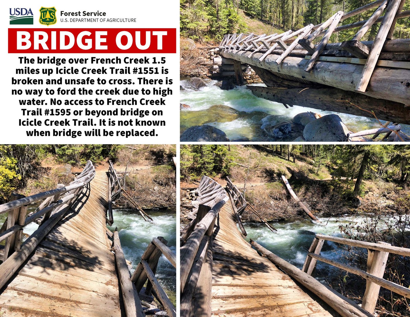 I didn’t actually do this hike but saw on the Okanogan-Wenatchee National Forest twitter 5/12/21: “ALERT-The bridge on Icicle Creek Trail #1551, 1½ miles from the trailhead, was damaged and is not safe to use. This trail accesses the French Creek area of the Alpine Lakes Wilderness. Trails #1551 and #1595 are impacted. For more info call Wenatchee River R.D. 509-548-2550.”
