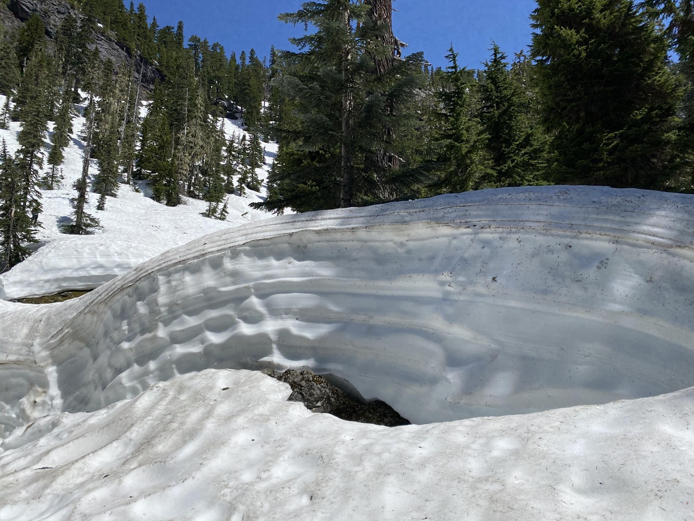 We glissaded down a steep slope just below the big boulder where the viewpoint was at incredible speed. Mom lost her pole on the way down. It was fun. We eventually arrived at the lake and ate some snacks. I noticed the snow started to melt underneath over the edge. I even used my pole to measure where the melting point was.