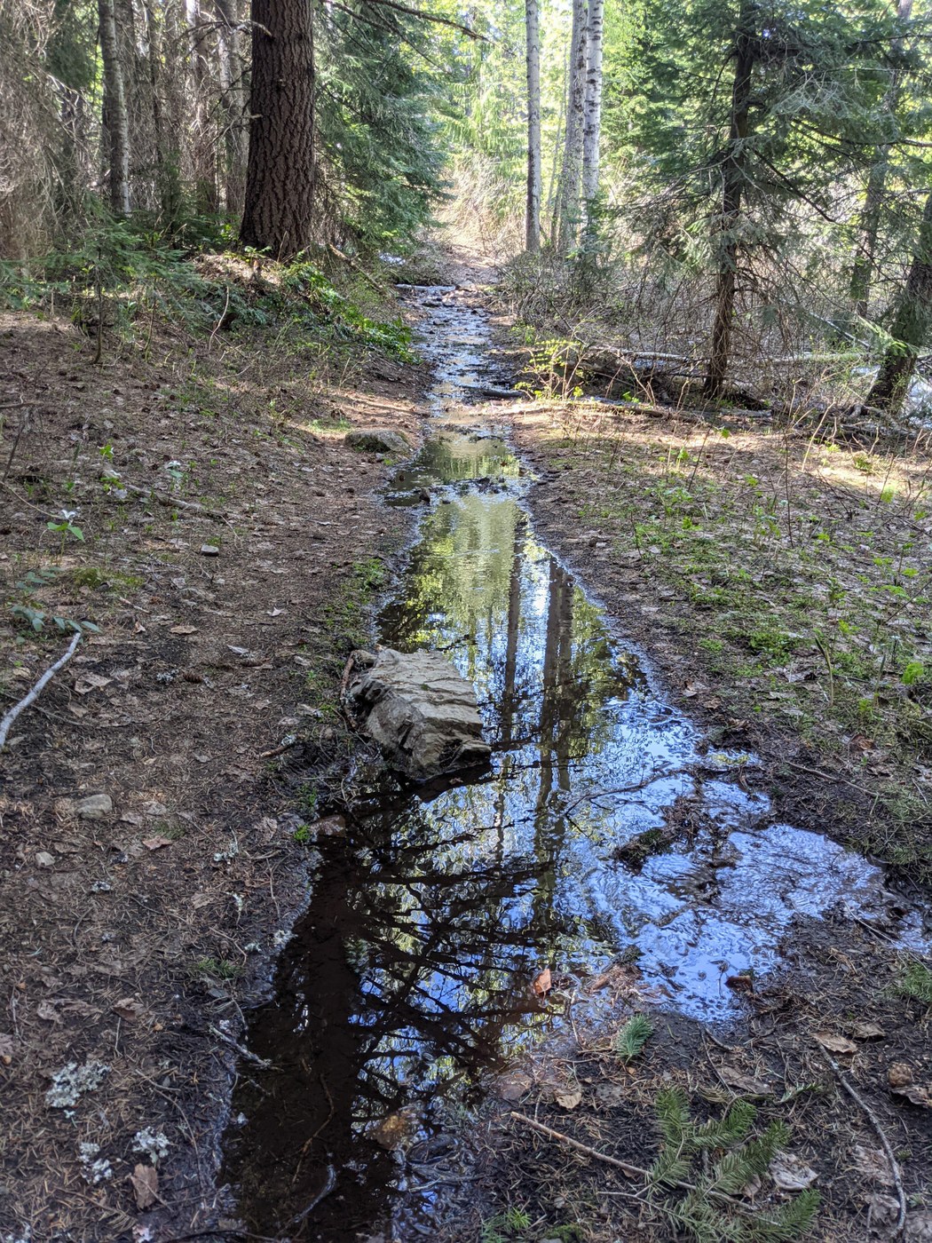 We counted a total of 6 downed trees blocking the trail, 2 of which covered the trail the length of the tree leaving you really only 2 choices. If you choose to go around watch out for ticks! Also encountered several patches of snow, mud and running water covering trail. Note: Just before you hit the damaged bridge (from Icicle Creek Trailhead) there are 2 beautiful campsites at waters edge.