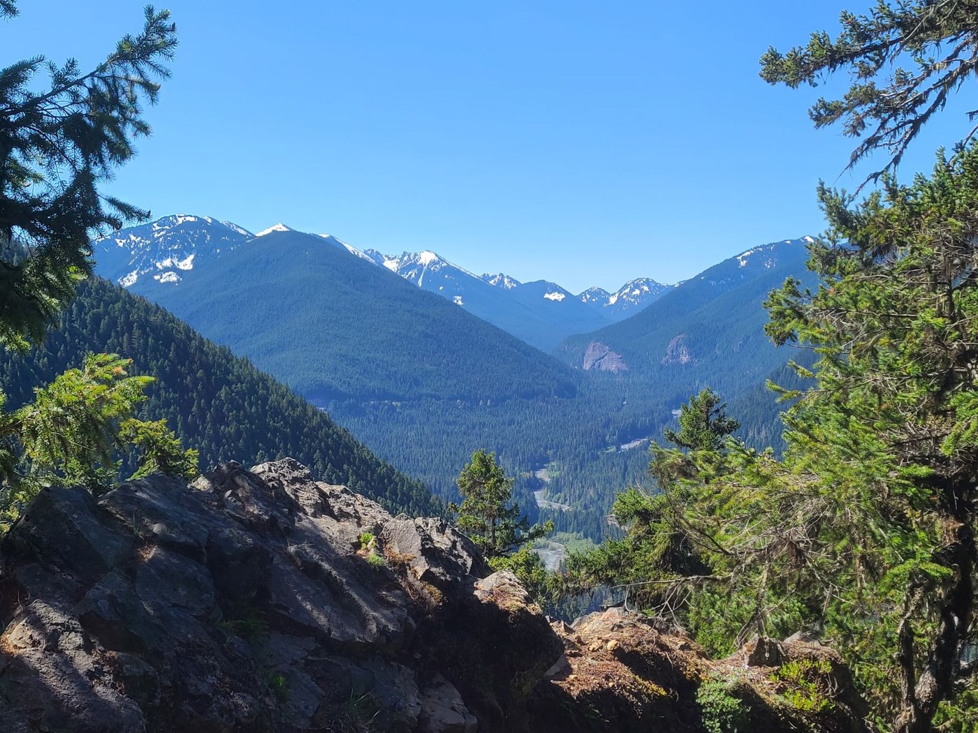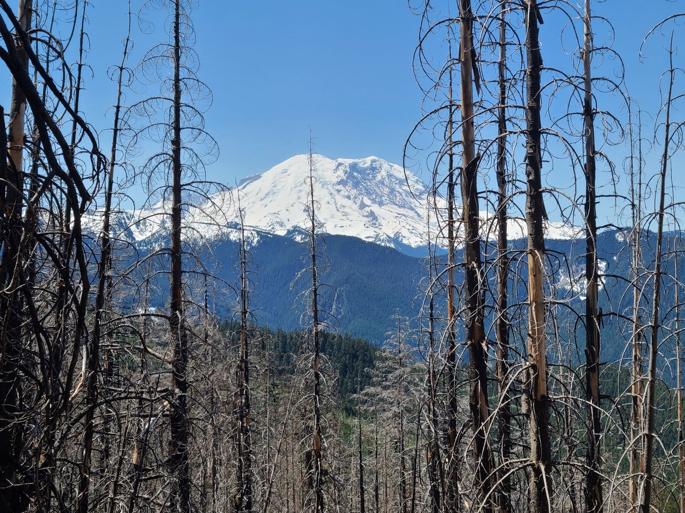 The views from the viewpoint near Little Ranger Peak at 2.6 miles are of the White River Valley, and you don't get a clear view of Rainier. In order to see Rainier you have to climb past the intersection with the Palisades trail at 4.6 miles and 5200', where the snow became much more solid, and either climb a little higher on the Little Ranger Peak trail (1/4 miles past the Palisades intersection and bushwhack out on an arm to the west) or head out on the Palisades trail. I didn't climb all the way to the ridge as the snow was too deep and the trail was buried just after the Palisades intersection.
