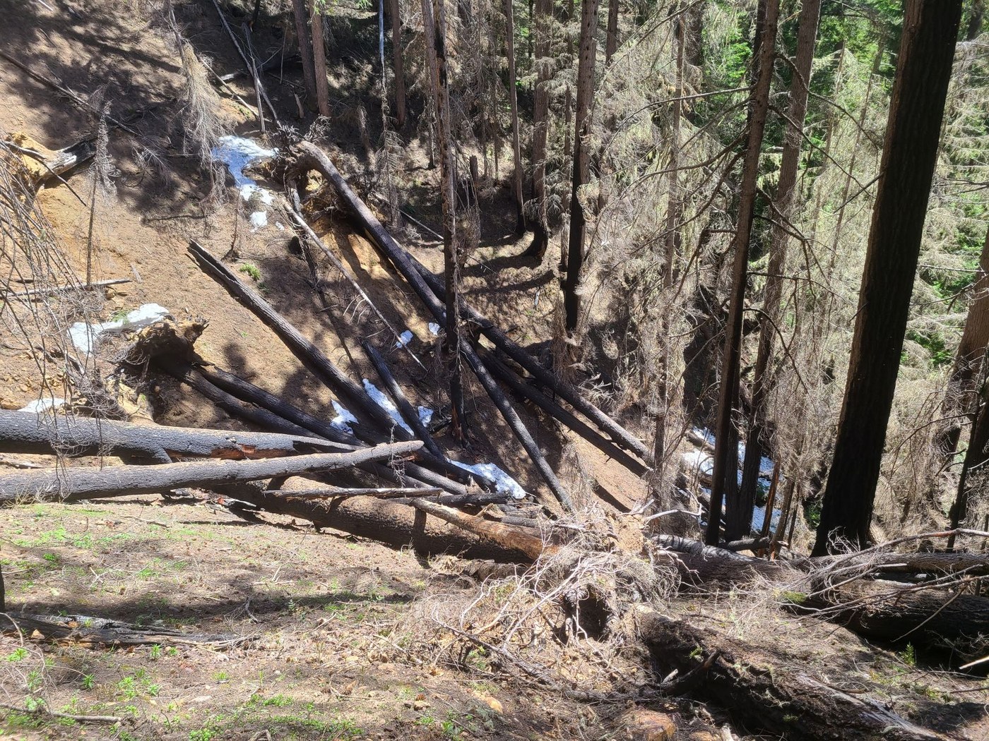 This trail melts out early with its south facing-slopes, making it a good choice for a long walk with a climb in the spring. And the trail is well-built and in excellent shape: it is mainly earth (as opposed to rocks and roots) and climbs quite gradually over long switchbacks. In fact, I saw two bikers riding up it over the course of the day. But the beauty of the trail is quite damaged by the significantly scarred, burned forest, which starts about 3 1/2 miles up and continues all the way to Dalles Ridge. You can see the burned trees lining the top of the ridge as you climb.