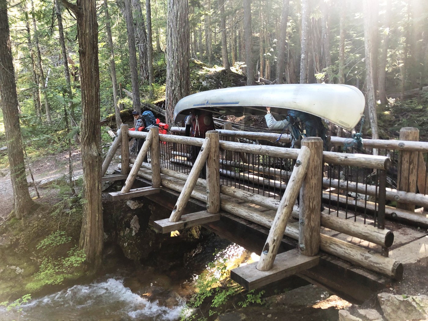 On Monday, we canoed back to the Ross Dam boat launch and portaged the boats up to the highway. Taking a break at the road-trail junction and walking down to the dam was worthwhile. This portage was the least pleasant part of the trip, but at least it was immediately followed by dinner at Glacier Peak Eatery!