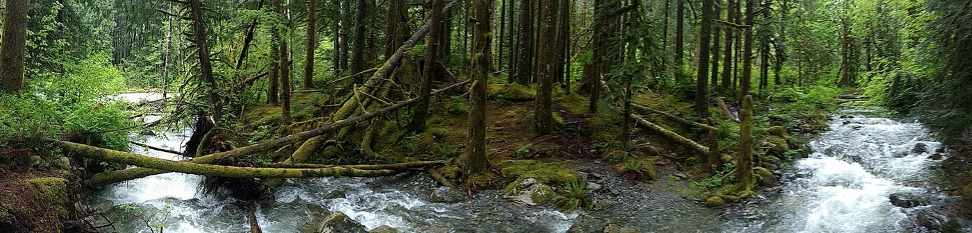 It was misty and cloudy the day we were there, so I include a panorama of the stream at the decently sized parking lot where there are picnic tables, a (full at the time) dumpster, and a vault toilet. The campground back across the bridge has well-spaced sites, even a campground host.