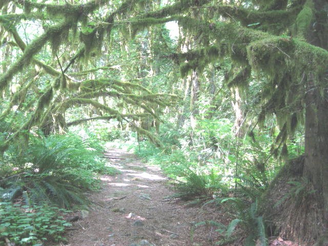 This is a 2 mile road turned into a trail that goes to a mine. It is an easy trail in most places broad and flat and maybe 200 ft gain max. It is true that there are overgrown sections but the overgrowth is salmonberries. Lots and lots of salmonberries! The moss covered tree trunks with sunshine dappling through the canopy is simply lovely.