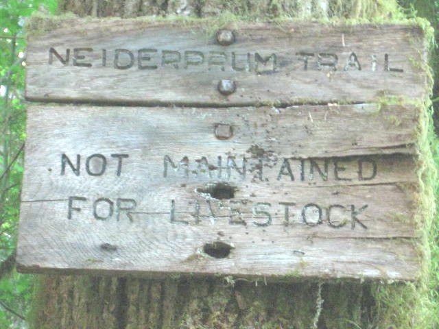 The trailhead is just the end of a short potholed road with parking along the sides and no outhouse. To the right is a gated dirt road to who knows where and to the left are the boulders before a bridge. Crossing the bridge and going about a mile there is a sign for the Neiderprum trail. The book says that's a 3000 ft tortuous vertical ascent to a sloped meadow. Skip it.