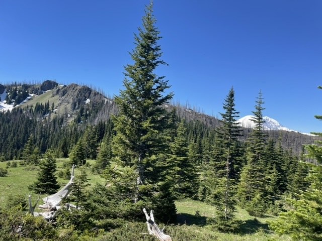 As part of the SISU PNW 24 hour endurance race based at Camp Sheppard I ran from Camp Sheppard to Noble Knob via trails paralleling SR 410 and then using part of the trail to Little Ranger Lookout and peak. All the trails in this area were in good shape and I saw several mountain bikers out enjoying a ride. The only snow was a few patches in the shade when I was within about 1-1.5 miles of Noble Knob. These were melting fast and easy to cross - I saw a fairly young child walk over some with his mom. There’s one snowy patch near the top of the knob which is trickier to cross since you are a bit more exposed but people had gone beneath it to create an easier path on a lower snow patch. I just went slow and used my poles. I had micro spikes but didn’t feel the need to use them at all.