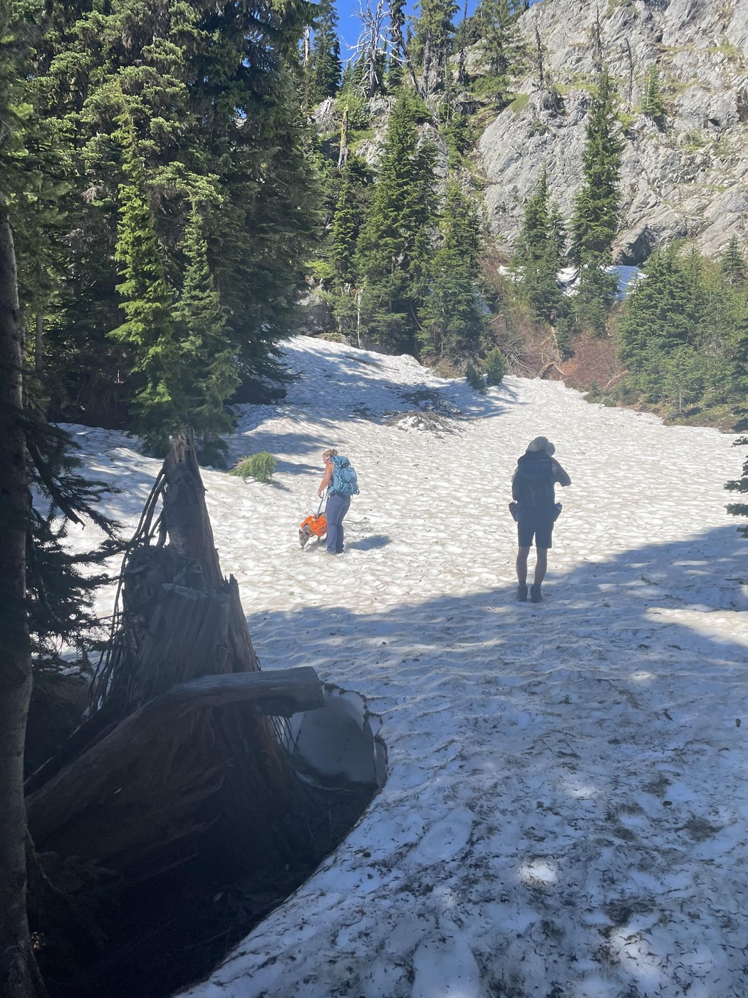 Hiked to Thorp lake late in the evening. It was almost impossible to avoid getting your feet wet. First stream crossing is knee deep and the rest are about ankle deep. There was probably a way to navigate around but the water felt good on a hot day. It was also muddy in some sections and a few trees across the trail. Camping sites at the lake are snow free.