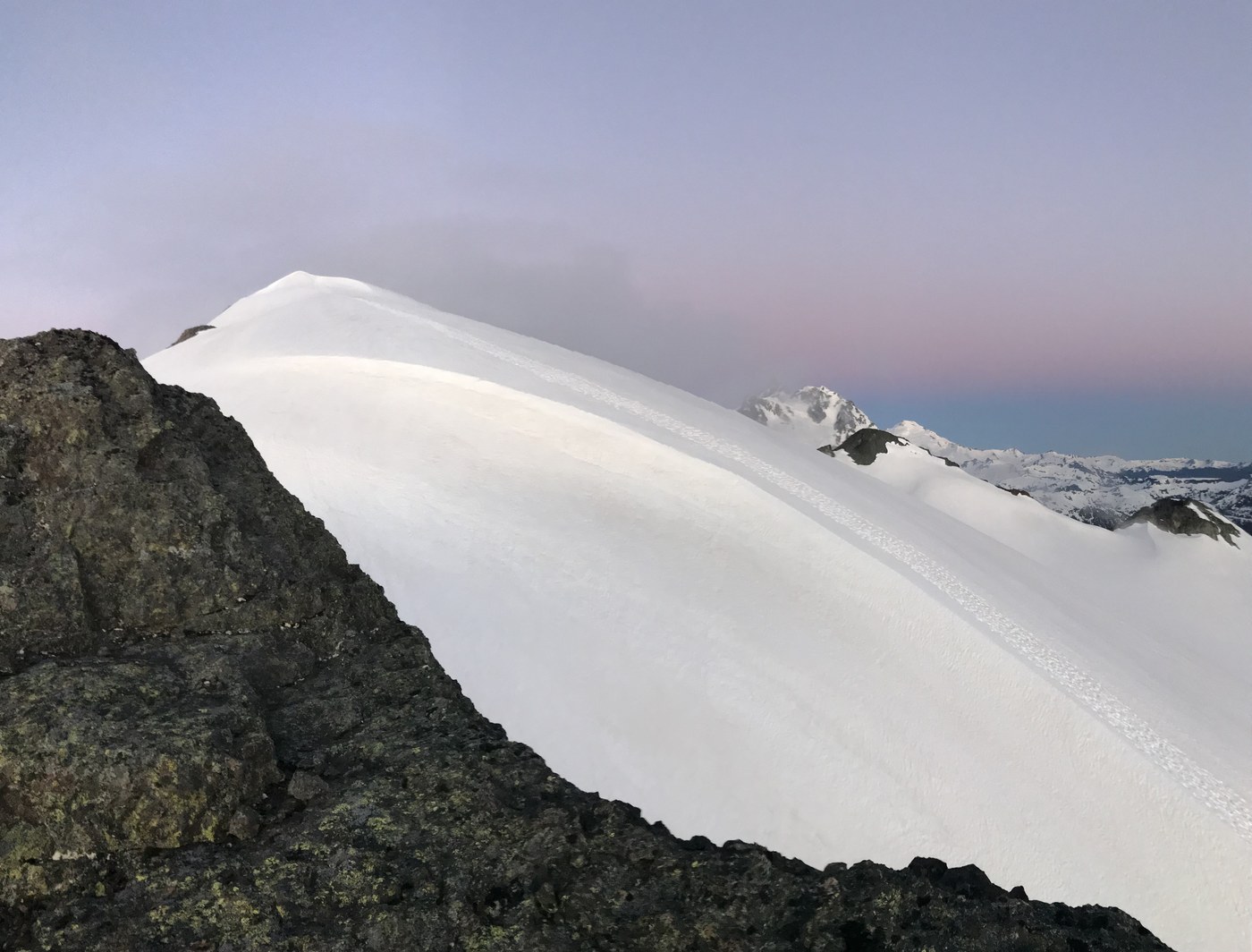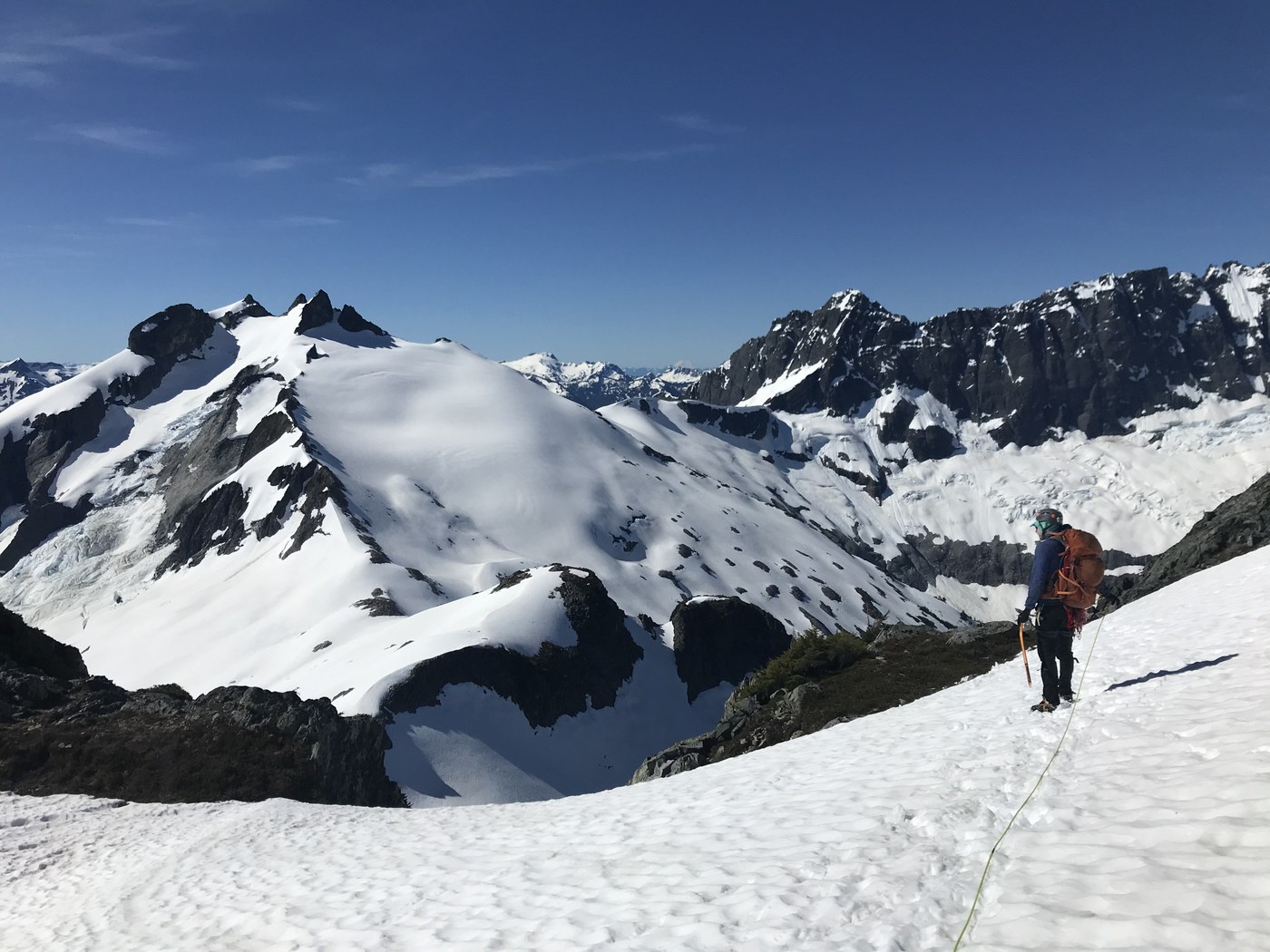 Snow began consistently at the base of the Hannegan Meadow where the trail begins to switchback up to the Pass. I imagine by now this snow has melted. Consistent and deep snow from the Pass all along Ruth’s arm. The glaciers crevasses are all filled in on the approach, but as we wrapped around the West side to head over to Icy, we saw crevasses starting to open. I have seen this glacier in late season and it’s no joke. So please exercise caution and rope up, even if it “looks chill.”