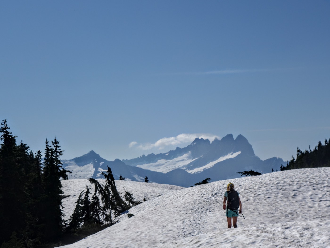 Intermittent snow starts just before the crossing of Suiattle Creek (which is well buried with debris and snow from an avalanche); mostly snow once getting to the top of the ridge and to the lookout - but the trail on the south side is melted out on the last portion; we used that instead of the existing boot pack which went up an uncomfortably steep pitch. Used one yak-trak each which was nice but could have done it without.