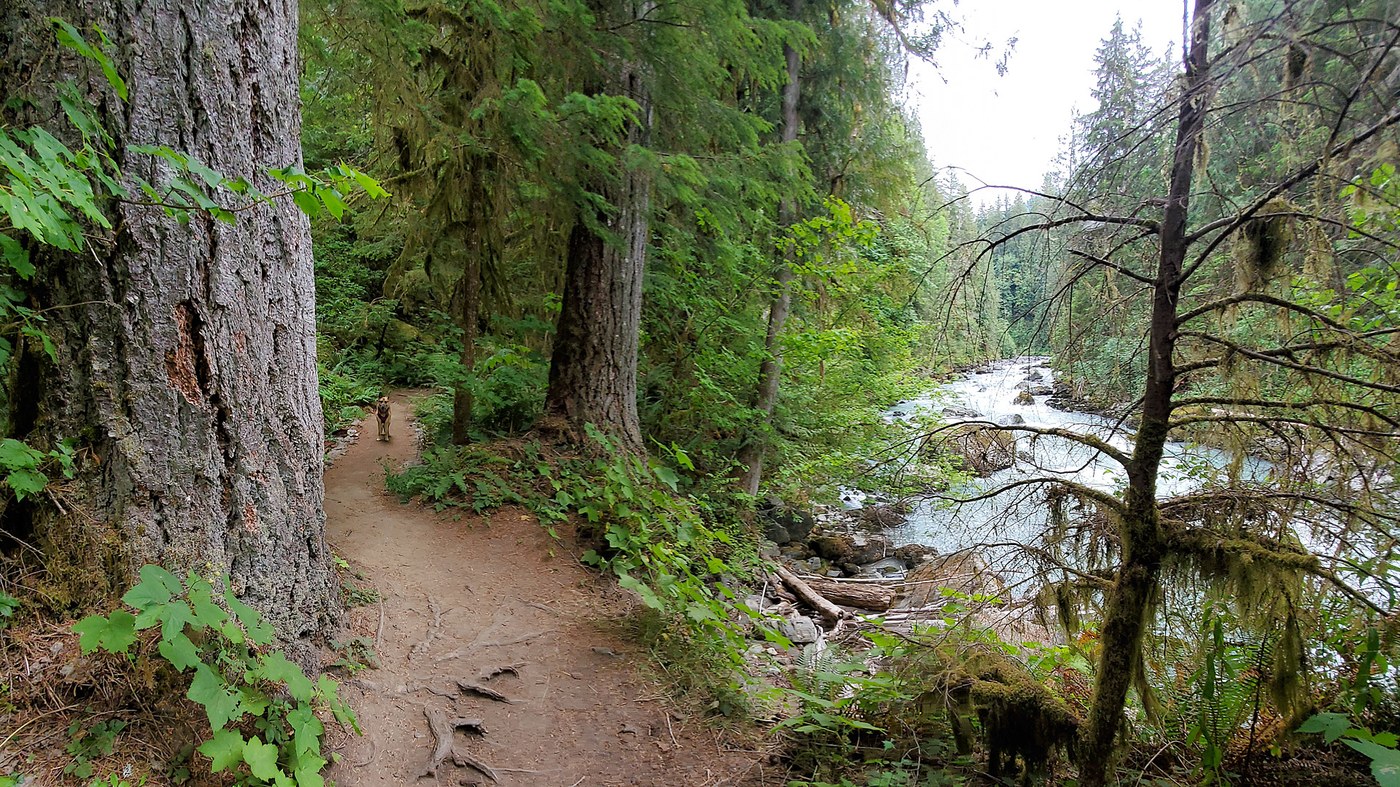 It was overcast and not burning off, and while I'd debated Heliotrope, I wasn't excited about the long, potholed road and water crossings if there was slim chances of a view (as it turns out, a trip report from yesterday showed the trail topping out over the clouds). Same with the long drive to Artist Point, so we opted for the closer in woodsy walk along the Nooksack.