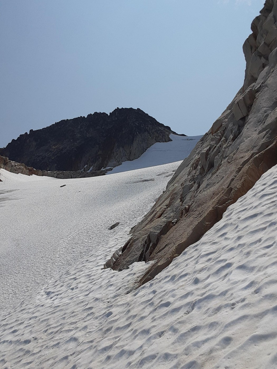 Climbed Silverstar today, the creek crossing wasn't bad there is a good tree to walk across and the path is marked with cairns although a little overgrown on both sides of the creek. Bugs were relentless until I reached the glacier. Conditions on the glacier were good. Snow is melting quickly there are a couple of spots melted down to bare glacial ice, these can be avoided for now. I had heard from multiple sources about the scramble at the top. I did not find it too bad. It's 3rd class with perhaps the last 8-10 ft being 4th class although it's very solid rock with good holds just a bit exposed. Gear brought ice axe, boots, crampons, stove to melt snow(I heard there was no water past the col). Gear not used; crampons, and stove(I found a runoff stream near the glacier I marked with cairn)