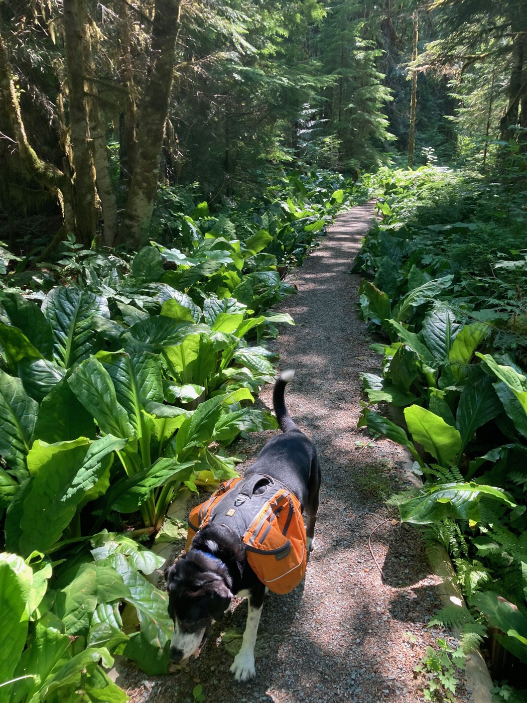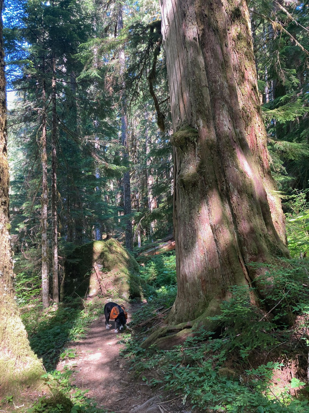 Trailhead parking lot was mostly full but didn't see many people on the trail, as there are lots of trip options that depart from there. The forest is splendid - words and photos don't do it justice, the magnificent old-growth cedars and firs and giant skunk cabbage and devils club in the understory. I am glad my dog is a slow hiker and stops a lot to sniff, as it gave me the chance to admire this magical place. There are also plenty of spots to get water along this stretch of the trail.