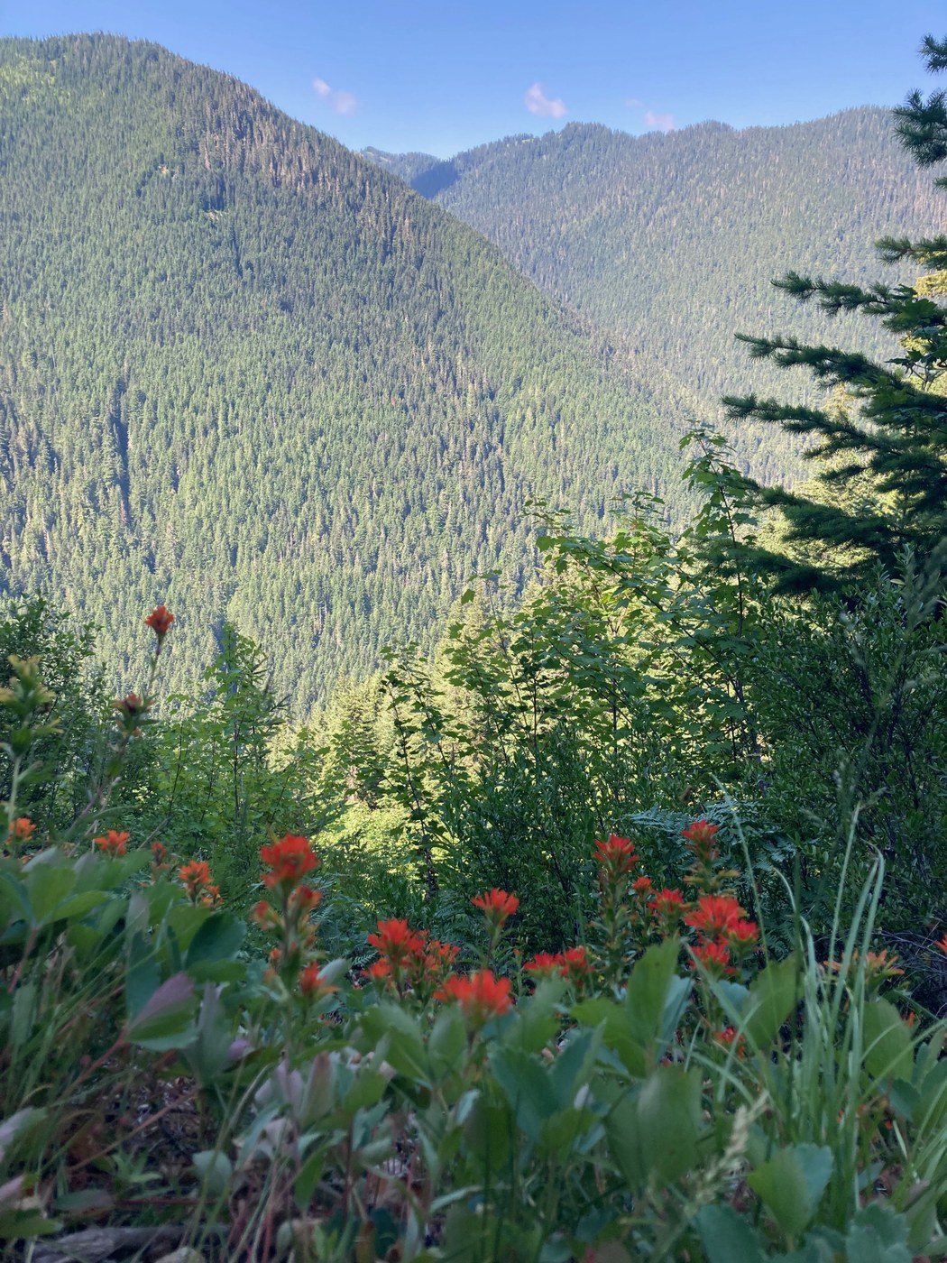 On our second day, my dog and I went about a third of the way up to White Pass. The switchbacks are relentless but soon views of the valley open up and the trail passes through some flower gardens with tiger lilly and paintbrush currently in bloom. We ran into a few hikers heading up to climb Glacier Peak or spend a day or two in the high country.