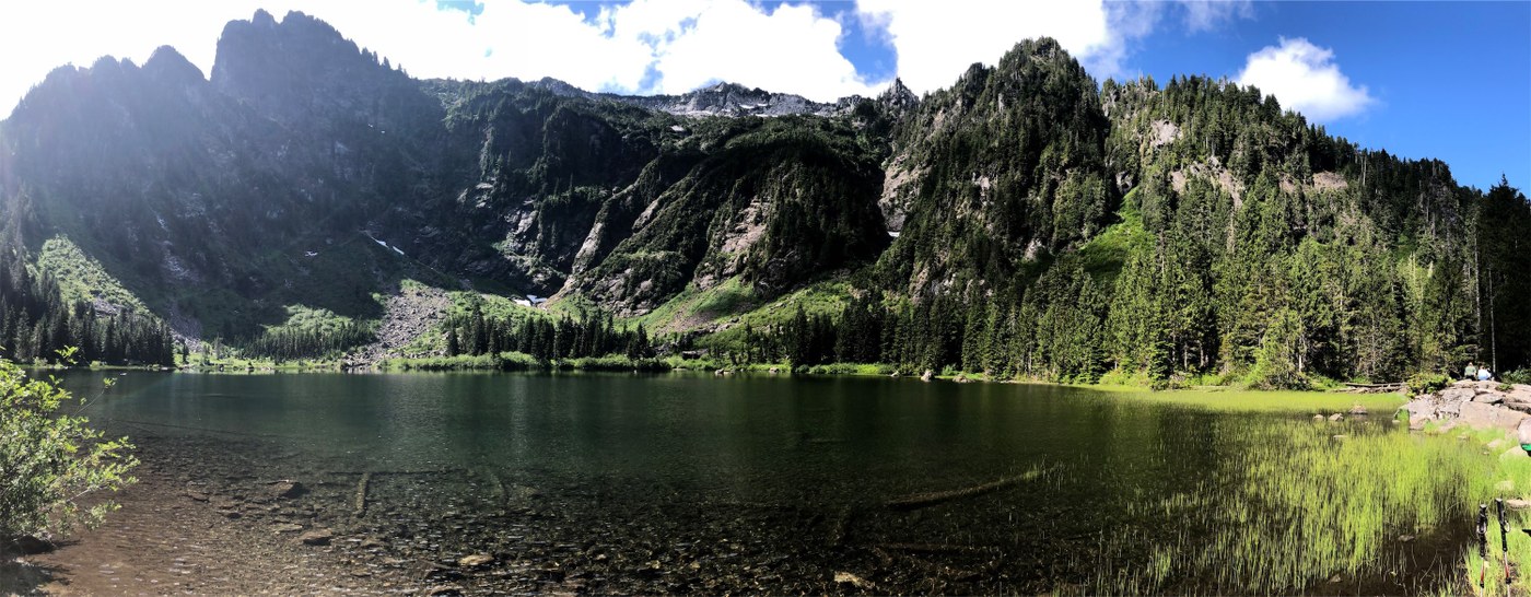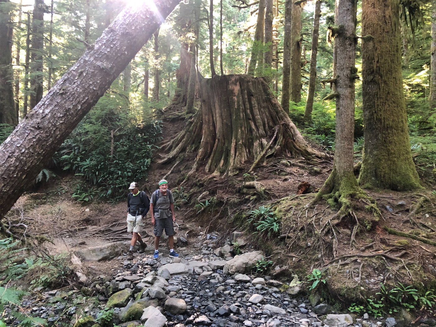 Geezer Patrol arrived at the TH at 0830 to find an empty lot. It was full upon our return in the afternoon. It had been two years since our last visit and of course, a significant portion of our memories was missing as we re-enjoyed being amongst monster trees or the remains thereof. Though its only a couple of miles, the trail can be a little tough in spots. Bottomline is that if you aren't standing on rocks or roots, you are NOT on the trail. The first 1/2 mile has received a lot of care. Once you start zigzagging up the slope, the rocks n roots get bigger to become completely dominant until you peak a 1/4 mile from the lake. We enjoyed the first mile all by ourselves but were shortly lapped by 4 parties with higher energy content. Lots of TP left on or along side the trial and on 2 doggy bags as evidence of the high usage of this trail.