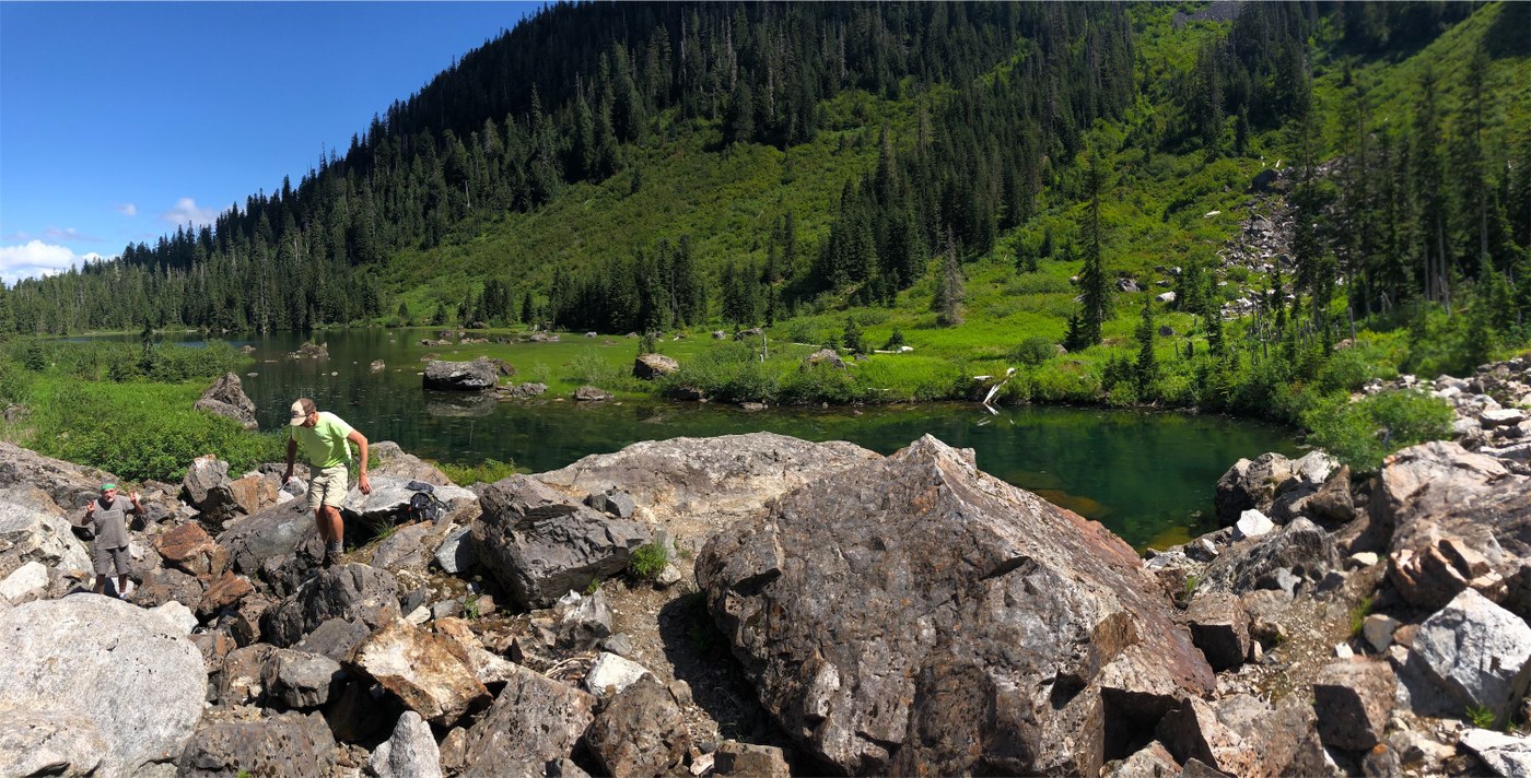 We did the clockwise circumnavigation of the lake and enjoyed lunch on the rocks at the south end. Somehow, there were no bugs to complain about on this sunny day with a light breeze. Could not have been better.