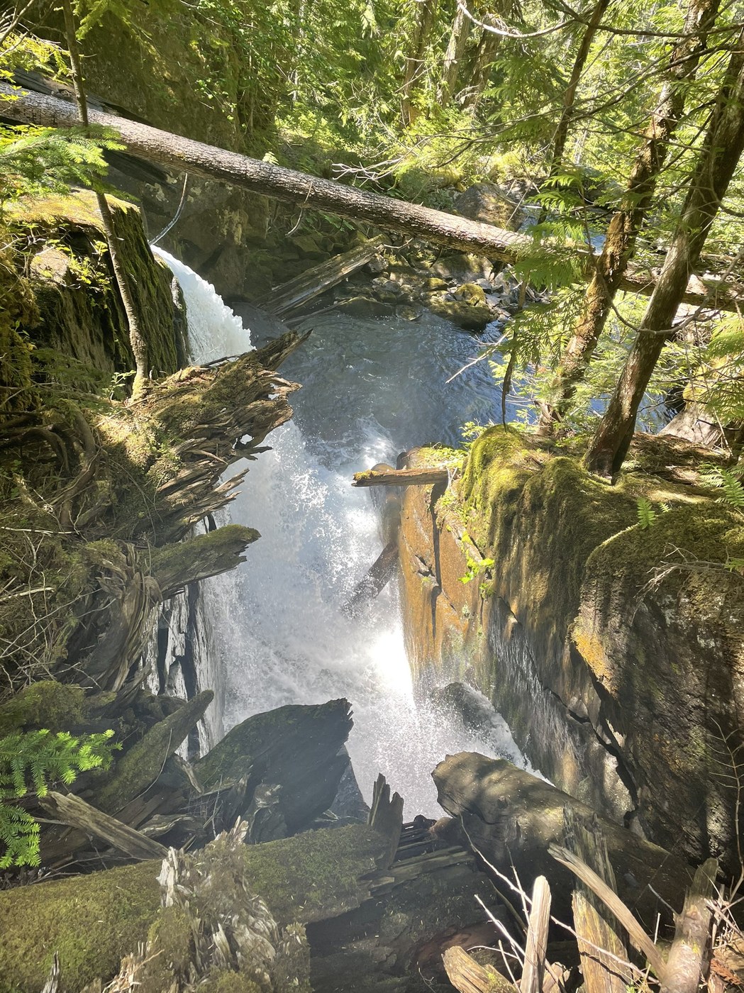 We took the lower trail out, which was amazing and very well maintained. Goat Lake is the objective but the progressively more impressive falls really steal the show. About half a mile after the upper and lower trails merge up, there’s a chance to step off the main route and explore the falls, which reach all the way down from the lake. I have never seen so many impressive falls stacked one on top of the other like they are here. We stopped for a snack, anticipating that Goat Lake would be more crowded.