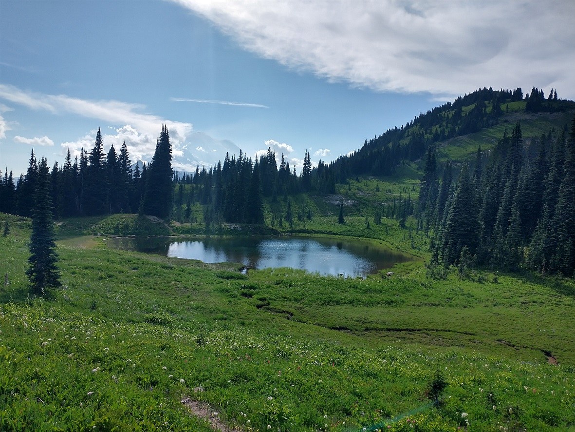 We hiked in a clockwise loop and there were incredible views the entire way, including great views of Mt Rainier for the final half of our loop. There were also many beautiful wildflowers to enjoy along with the small, scenic lakes. The trail was in good condition, aside from some braiding throughout, and it was a relatively easy hike with most of the elevation gain at the beginning.