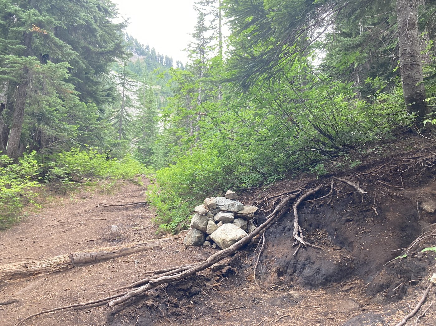 There’s currently a large cairn at the turnoff from the PCT, see photo, but these seem to come and go on this trail, so who knows how long it will be there. I don’t think it would be difficult to find as long as you’re paying attention. Start looking for it after you’ve gone down some short switchbacks, and if you come to a tarn on your left, you’ve gone a bit too far.