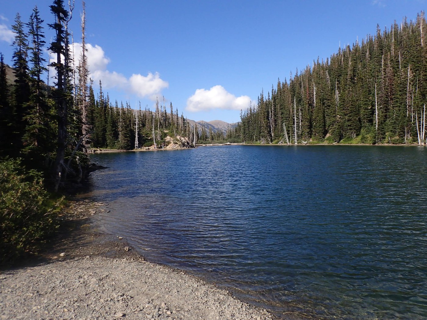 Going clockwise made more sense than CCW as there's no water between Ob. Pt. and Three Forks and carrying a full day's worth up 4500'+ over 12 miles is crazy. The gentle 3200' descent from Deer Park was much easier on the knees than would be that 2300' crazy steep Grand Pass to Cameron Creek drop. Of course that became a climb that seems to never end. Just be sure to water up from the stream you cross before leaving the trees as you're totally exposed from that point upwards until finally reaching the lakes an hour or two later.