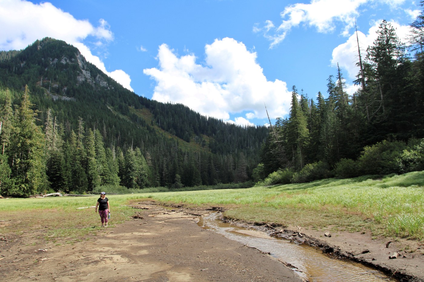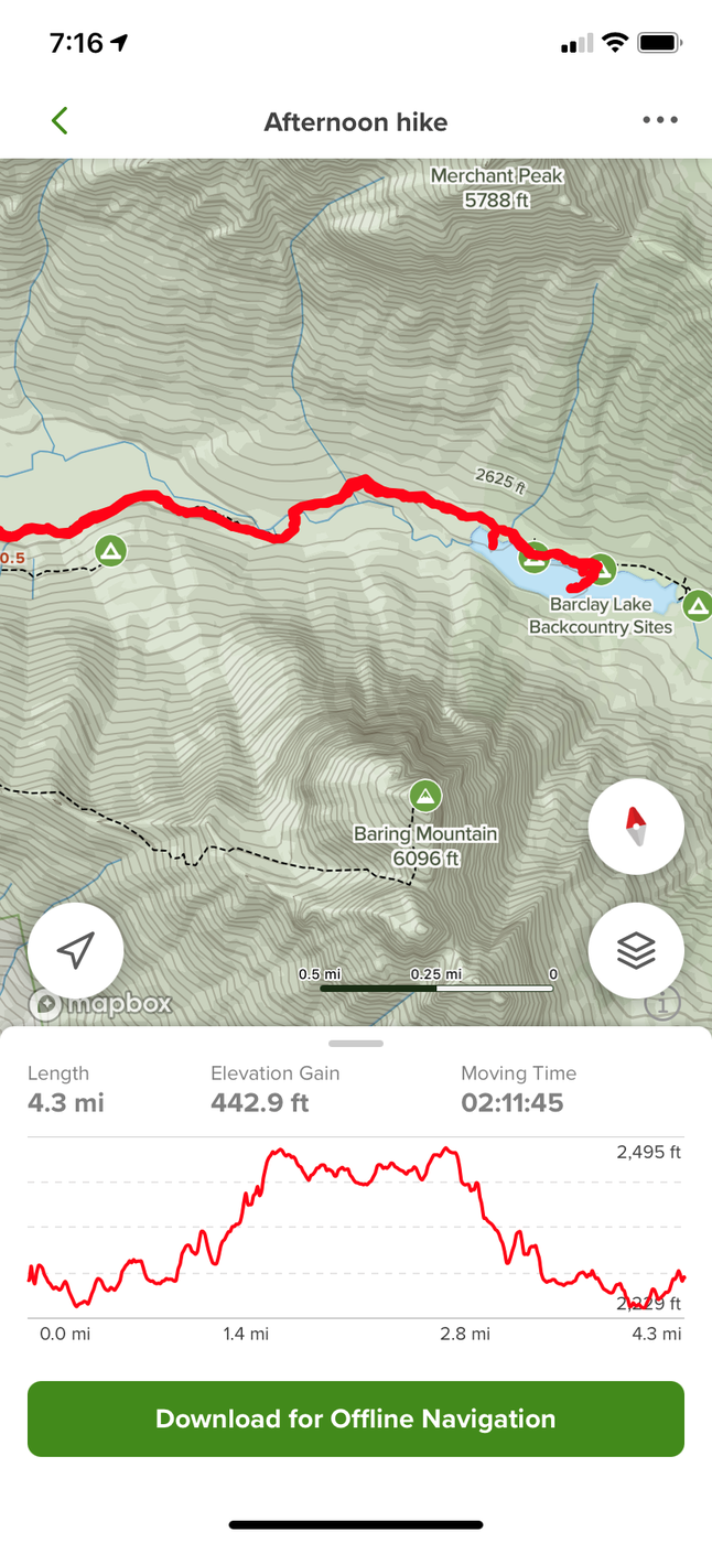 As for the lake it is way low right now. Compared to early spring or winter it is down 10-15' easily. So much the drainage is completely dry as shown in the pic below. We even walked out across the lake bed through the grass which can be seen in the alltrails map below. Where the red lines are is the current shorelines on both sides.