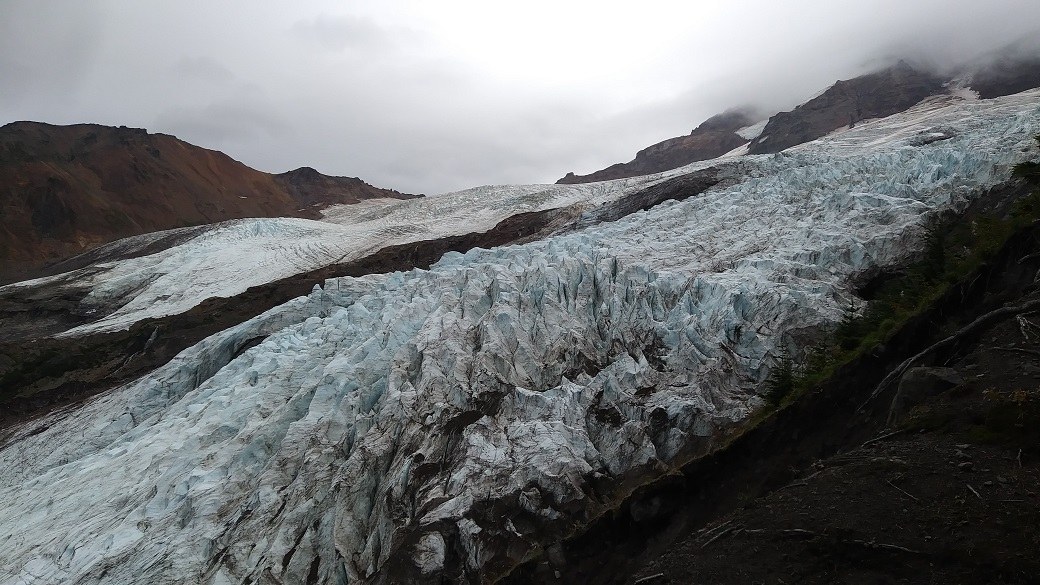 We had seen glimpses of the summit from the Mount Baker Highway on the drive out, but by the time we got past the climber's route and really broke out of the trees, the clouds were down to about 6500 feet. That was okay with me though because in my mind the point of this hike is not the summit views but the glacier views. And we had plenty of those, as you can see from the first picture.