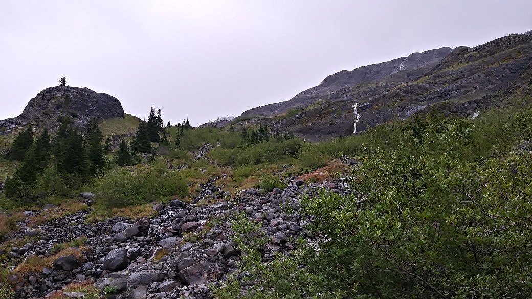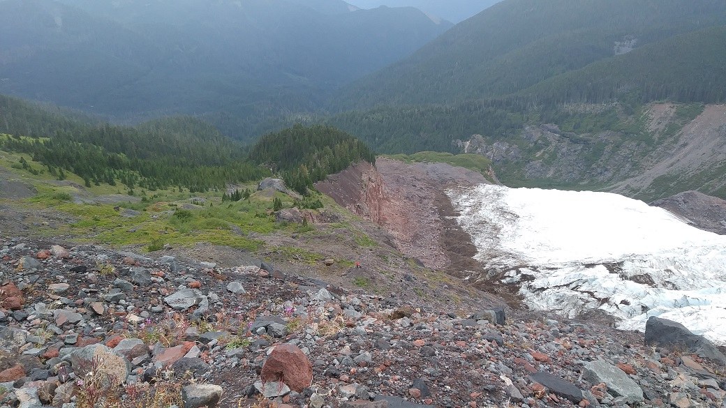 After the overlook I decided to head up a bit farther to get some different views of the glacier. At about 5900 feet the rocks got steeper and it started drizzling enough to make them slippery, so I headed back. The second picture is taken from near where I turned around. You can see my dad's orange jacket just below the center of the picture, and the overlook is just left of center.