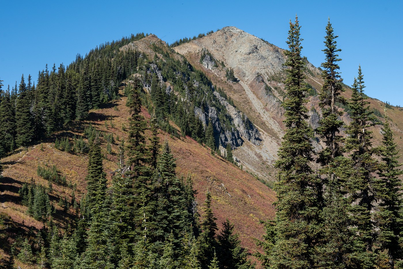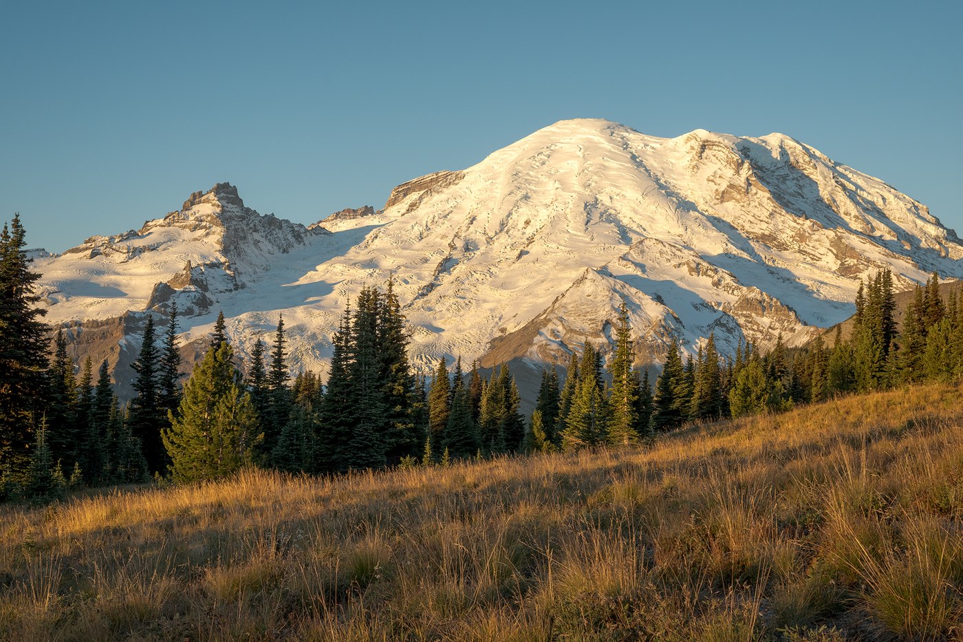 Although its not officially fall until tomorrow, it definitely felt like fall is here at Mt Rainier. I arrived at Sunrise around 7:00am, just after the alpenglow had faded off the mountain. Should have set the alarm a 1/2 hour earlier. The light was still nice on Rainier though. I probably have a couple dozen shots of Rainier on my memory card, as I kept turning around and taking another picture all the way up to Dege Peak. I still made it to the top by 8:00, so I decided to hike down the other side to Sunrise Point, and then on to Sunrise and Clover Lakes. The smoke that had been present on my last several hikes seems to have cleared, and I could see Mt Adams, Goat Rocks, Mt Baker and Glacier Peak. Mt Rainier had more snow than it had the last time (two weeks ago) I was at Sunrise as well.