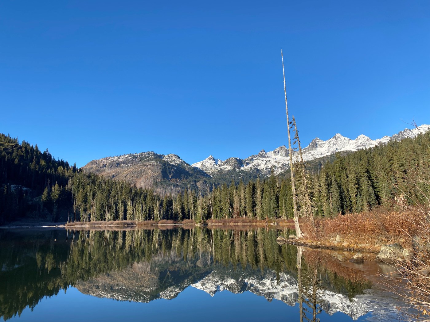 Took advantage of a beautiful fall day to get out into the Teanaway area. Trail to Pete lake is very wet and muddy in places. At the start of the day it was all frozen so not a big deal but as it warmed up things got sloppy. After arriving a Pete Lake took the Waptus pass trail, this trail is steep and rugged but passed by several very nice waterfalls. After arriving at the top of the ridge the trail really deteriorated into a big mess. Any flat section of trail held water, mud, ice or a combination of all three. My decision to go with boots instead of trail runners was a good one for sure. Some of the creek crossings were deeper than I was prepared for so I had to do some bushwacking to find different spots to cross on rocks or logs that were slippery with ice. Difficult traveling through this section of trail with all of the water, streams had overtaken the actual trail for several hundred feet in a couple of places. The hike up to Polallie ridge from Waptus pass was much better shape, snow overtaking the trail at about 5200 feet but only a couple of inches thick. Pretty uneventful trip down the Tired Creek trail to meet up with the Pete Lake trail. Not much in the way of big payoff views on this loop but if you are looking for a secluded day in the woods this is a great option. I saw a total of zero people on this beautiful Sunday and the dog had a great time.