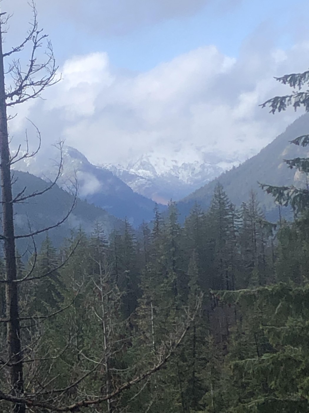 We hiked the Jolly Mt Road today for an hour. We drove up about two miles, parked, and hiked up and back from there. This road makes a great hike on a clear day because it offers great views west and north. After morning rain today, it started to clear as we were hiking. We got glimpses of snowy mountains like Lemah and Daniel. The snow level on the slopes around us looked like it was about 4500 feet. There is still some fall color around and there are a few larches here. Also, there is plenty of evidence of the 2017 Jolly Mt Fire in the burnt and blackened trees here and there. Once, about 3 years ago, I saw a wolf chasing an elk across the road as I was driving down. We saw no other people, or wolves, in the area today.