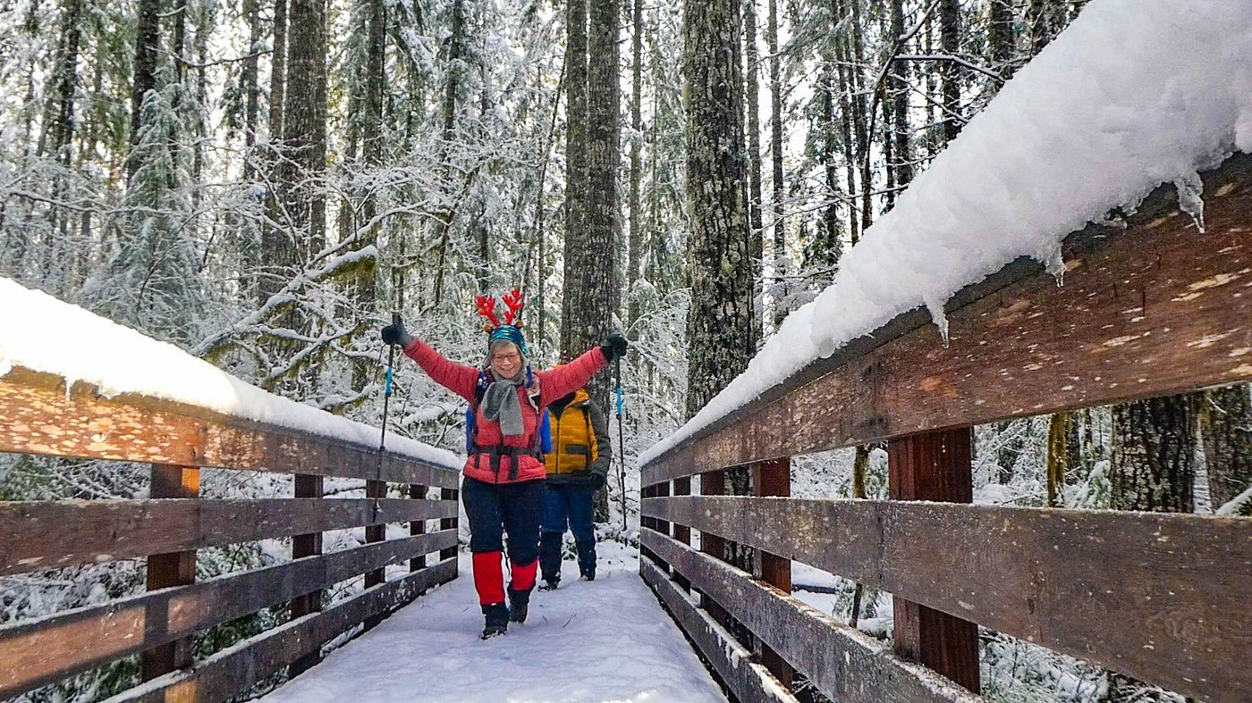There was 4 to 8in of fresh snow, but we did not need spikes or snowshoes. Lots of vine maples to duck under from snow weight but only 2 downed trees across the trail.
